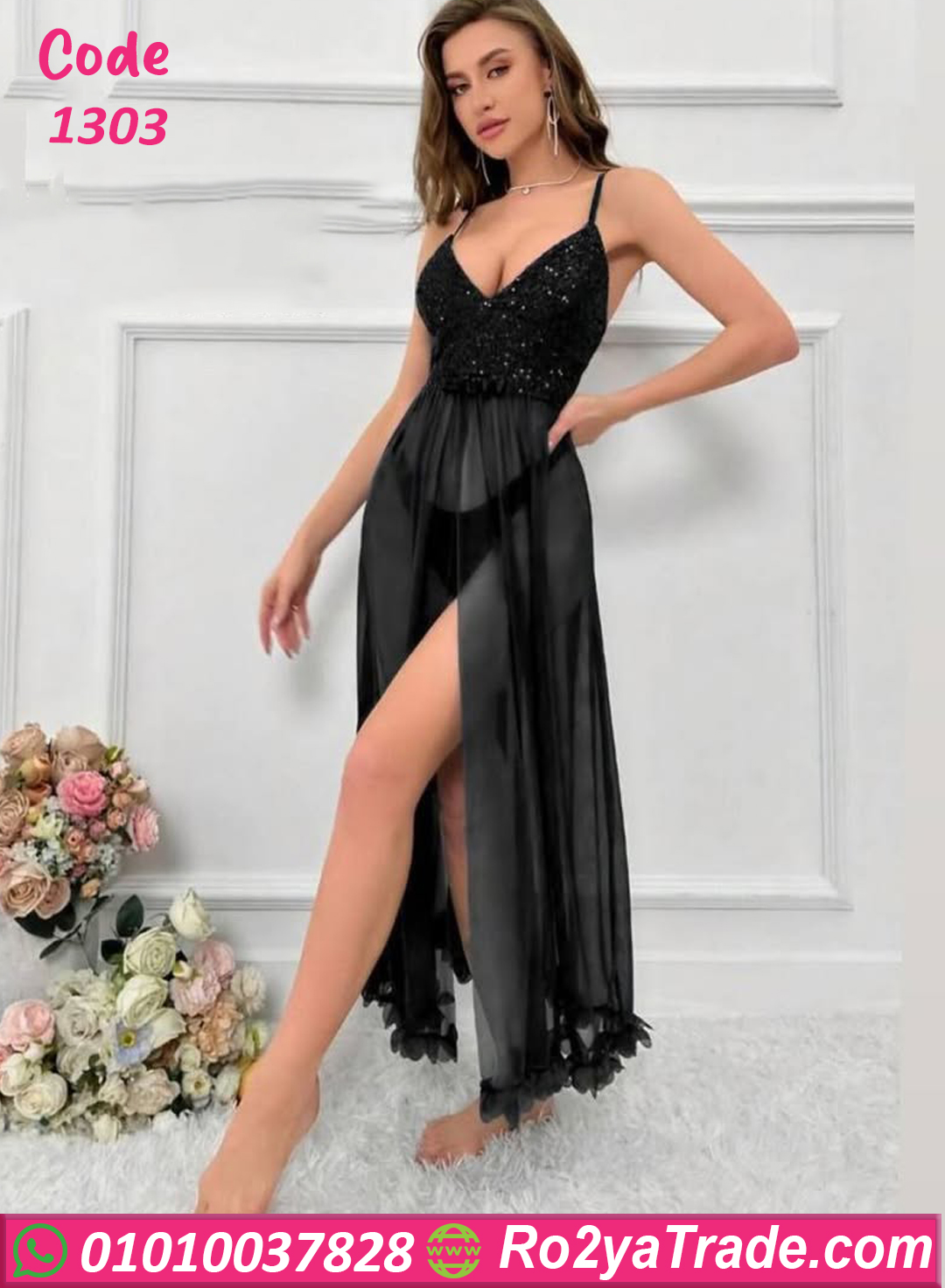 قطعة فخمة وأنثوية لانجري طويل تل دانتيل مستورد، تصميم شيك بجزء علوي لامع وشق جانبي جذاب 👗✨
