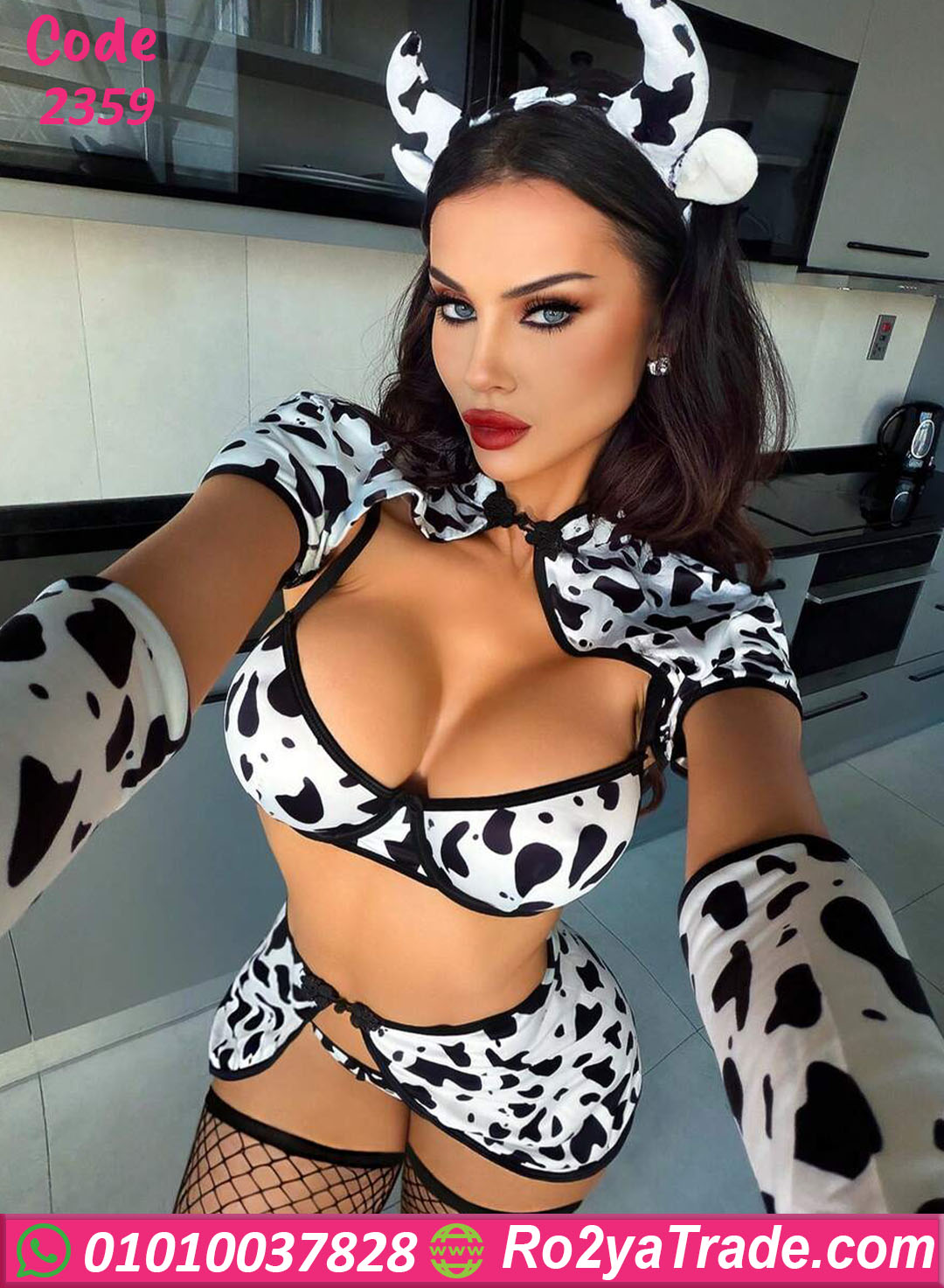لانجري حريمي تنكري بتصميم جريء مستوحى من شكل البقرة مع تفاصيل أنيقة وإكسسوارات تضيف لمسة مرحة وجذابة.