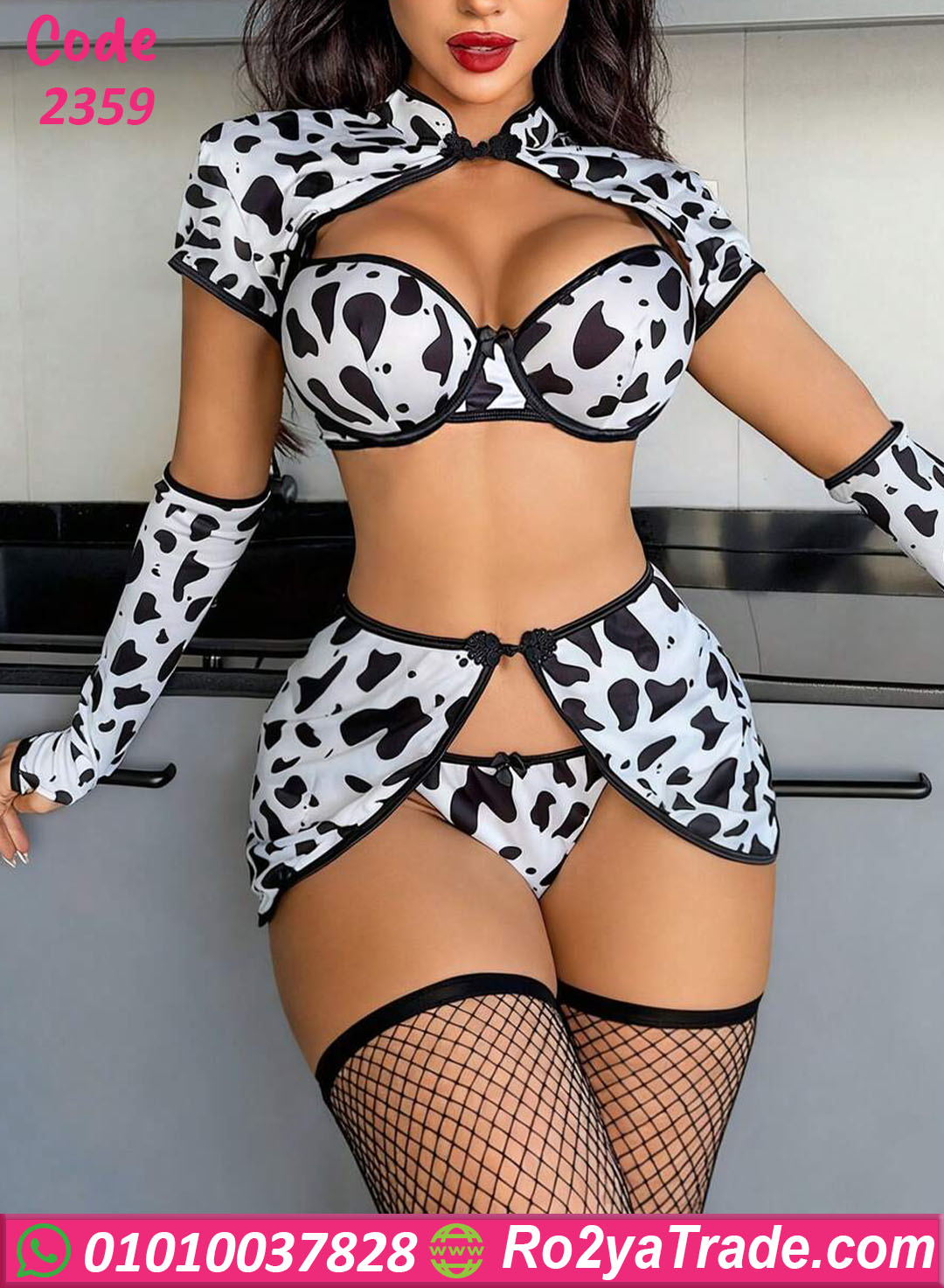 لانجري تنكري حريمي بتصميم مميز وجذاب مستوحى من أزياء التنكر المرحة ليمنحك إطلالة مختلفة ومثيرة في الأوقات الخاصة. يتميز هذا الموديل بتصميم فريد بنقشة البقرة بالأبيض والأسود والتي تضيف لمسة جريئة ومميزة للمظهر.