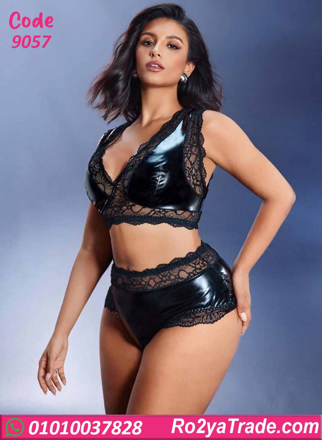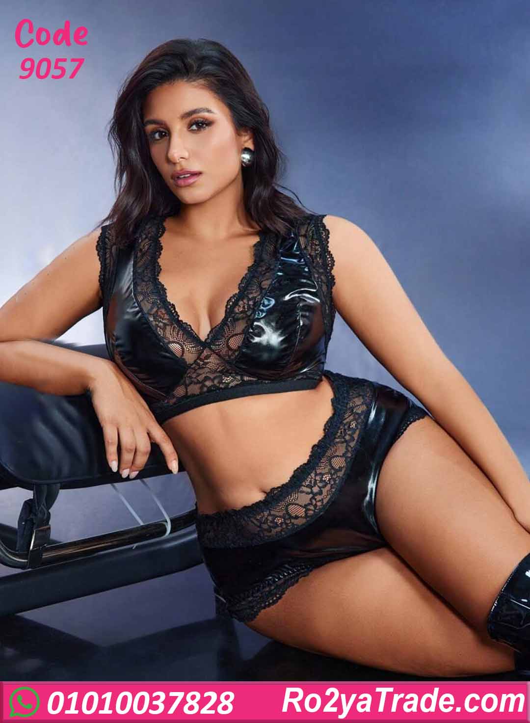 لانجري جلد كود 9057 مكوّن من قطعتين (برا + شورت)، بخامة جلد لامعة مع دانتيل ناعم يضيف لمسة أنثوية جذابة.