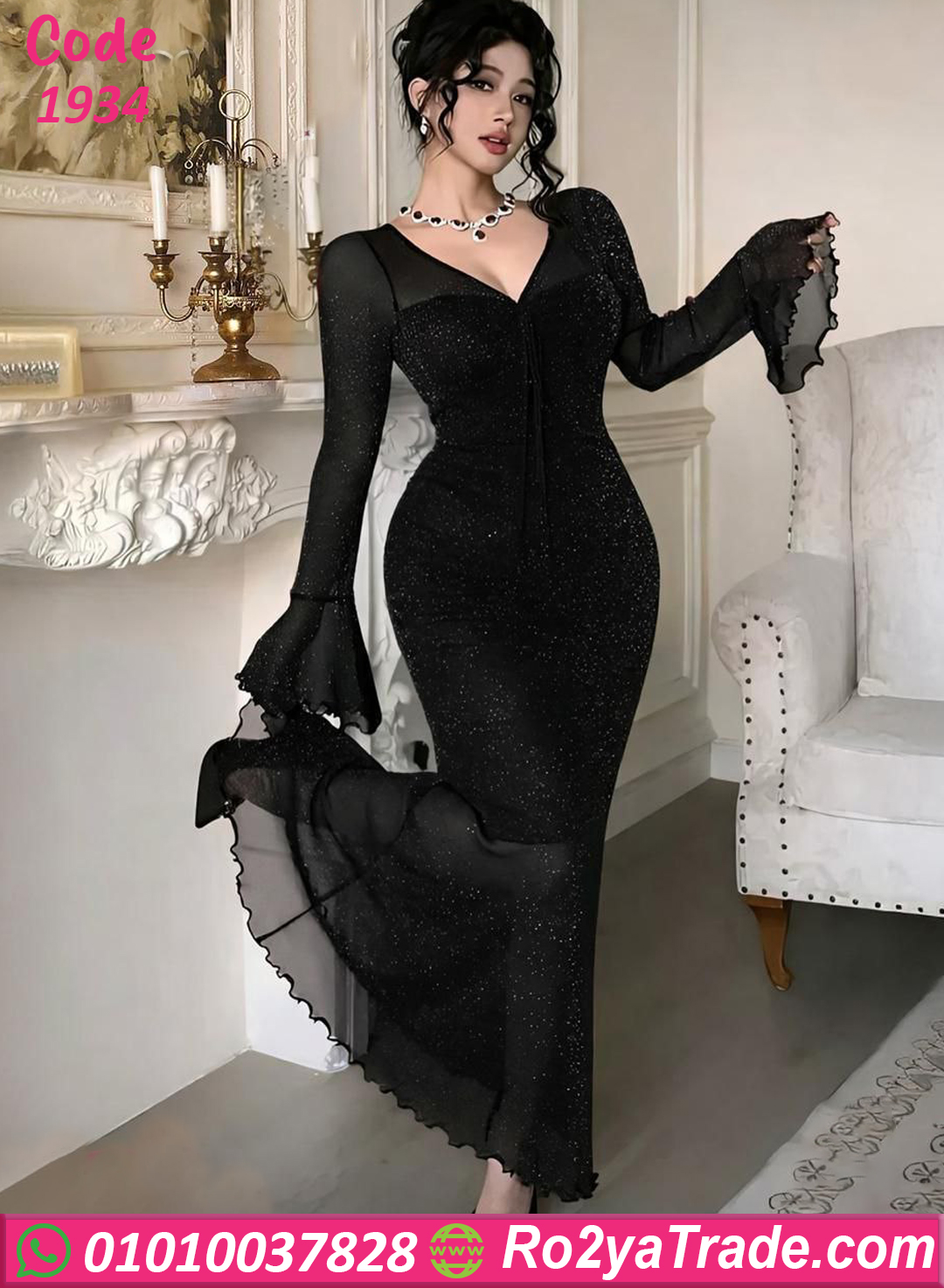 التصميم مزود بأكمام طويلة شفافة مع أطراف واسعة تعطي لمسة أنثوية جذابة وتضفي مظهراً راقياً على التصميم.