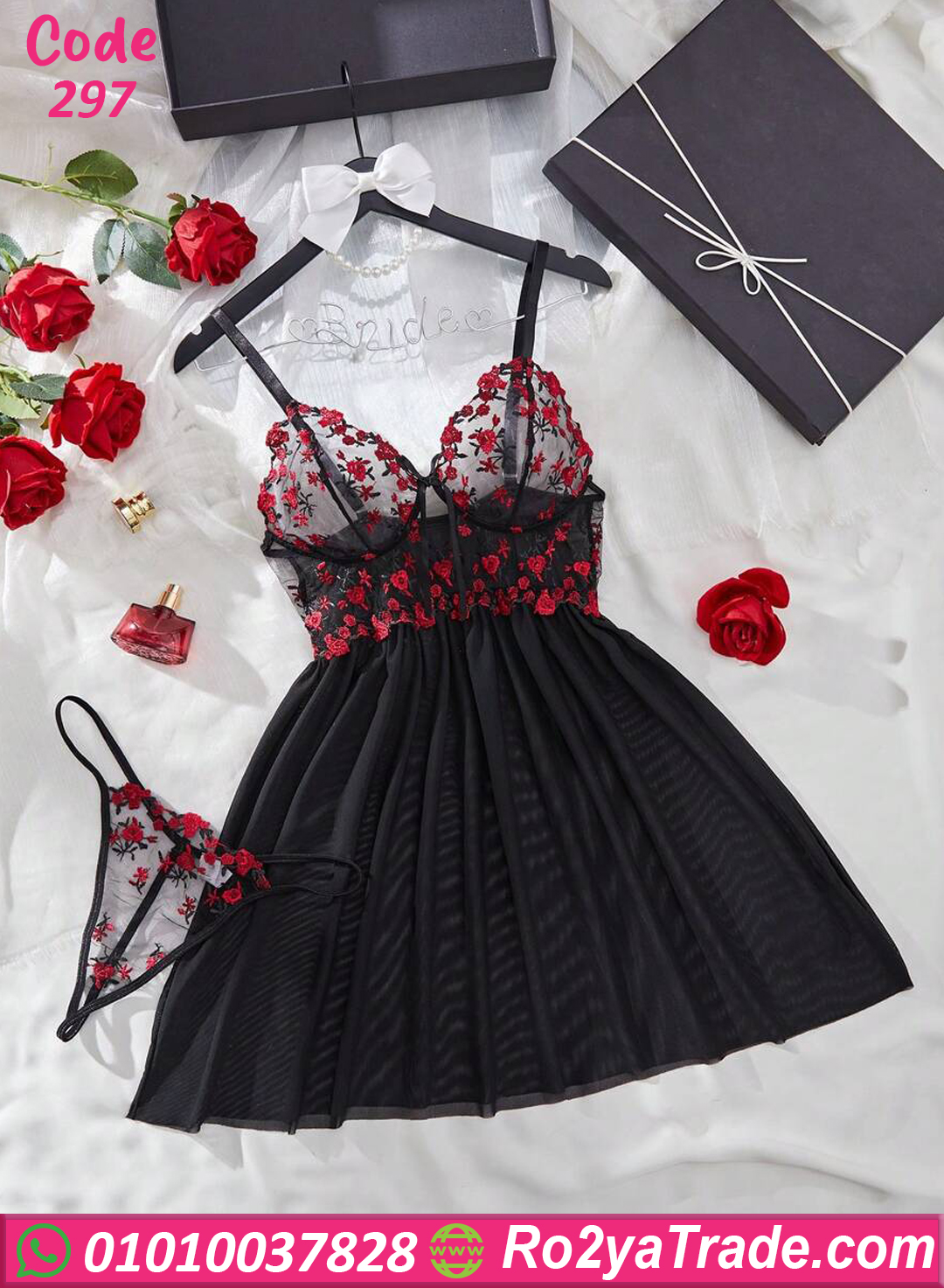 الجزء العلوي يأتي بتصميم صدر دانتيل شفاف مزين بتطريز ورود حمراء أنيقة تضيف لمسة رومانسية وجذابة.