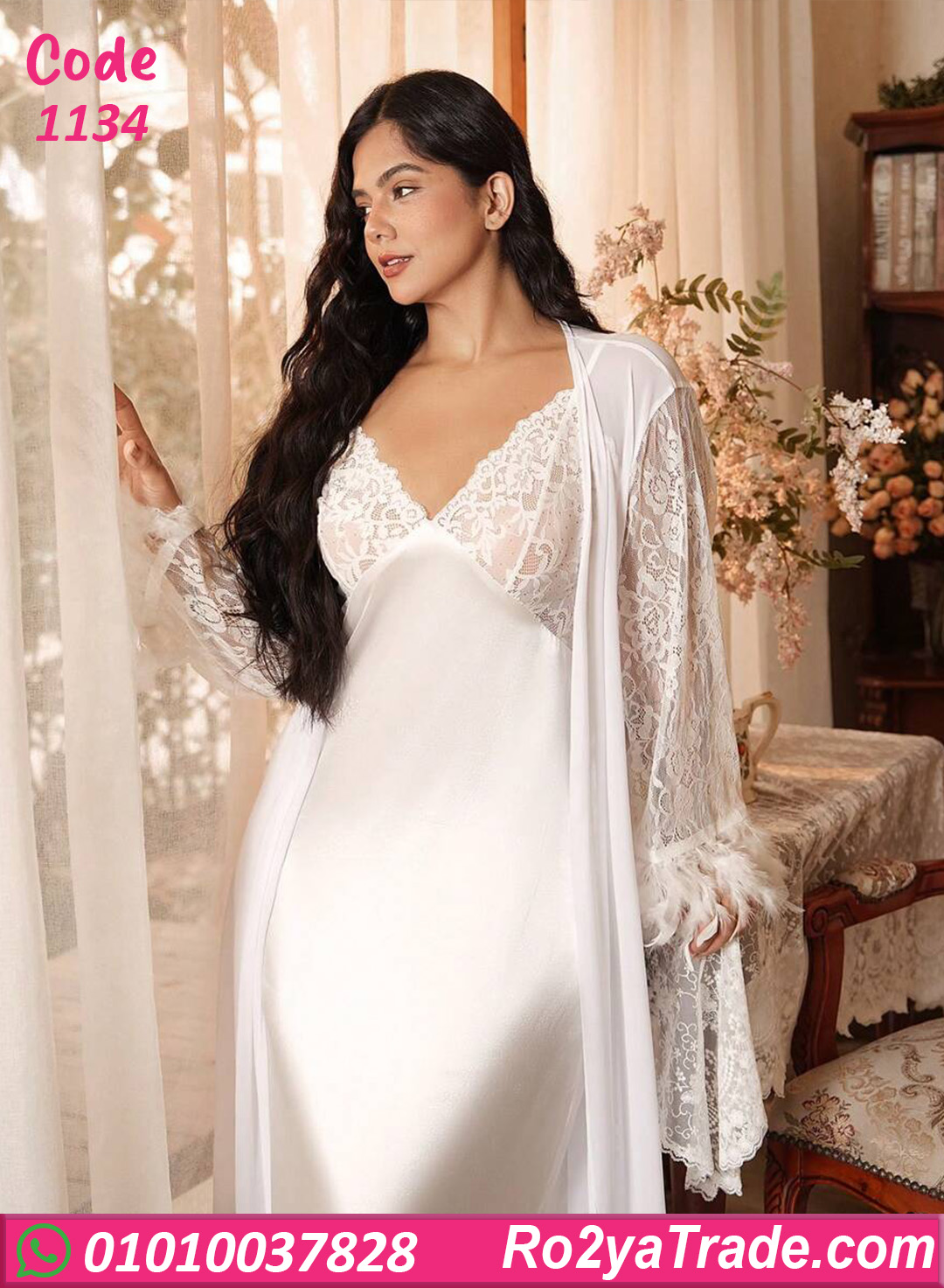 لانجري روب أبيض تصميم راقي وناعم، خامة ساتان مع دانتيل بتدي إحساس بالفخامة والأنوثة، مناسب للّبس في البيت أو للمناسبات الخاصة.