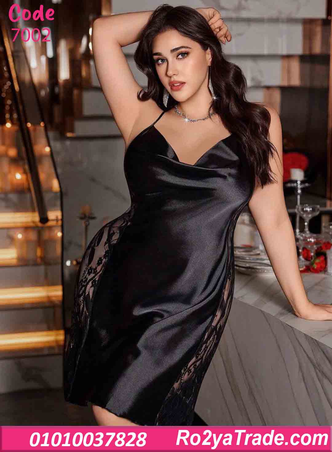 الموديل مصنوع من خامة ستان ناعمة تعطي لمعة جميلة على الجسم، مع جوانب دانتيل شفافة تضيف لمسة جاذبية وأناقة.
