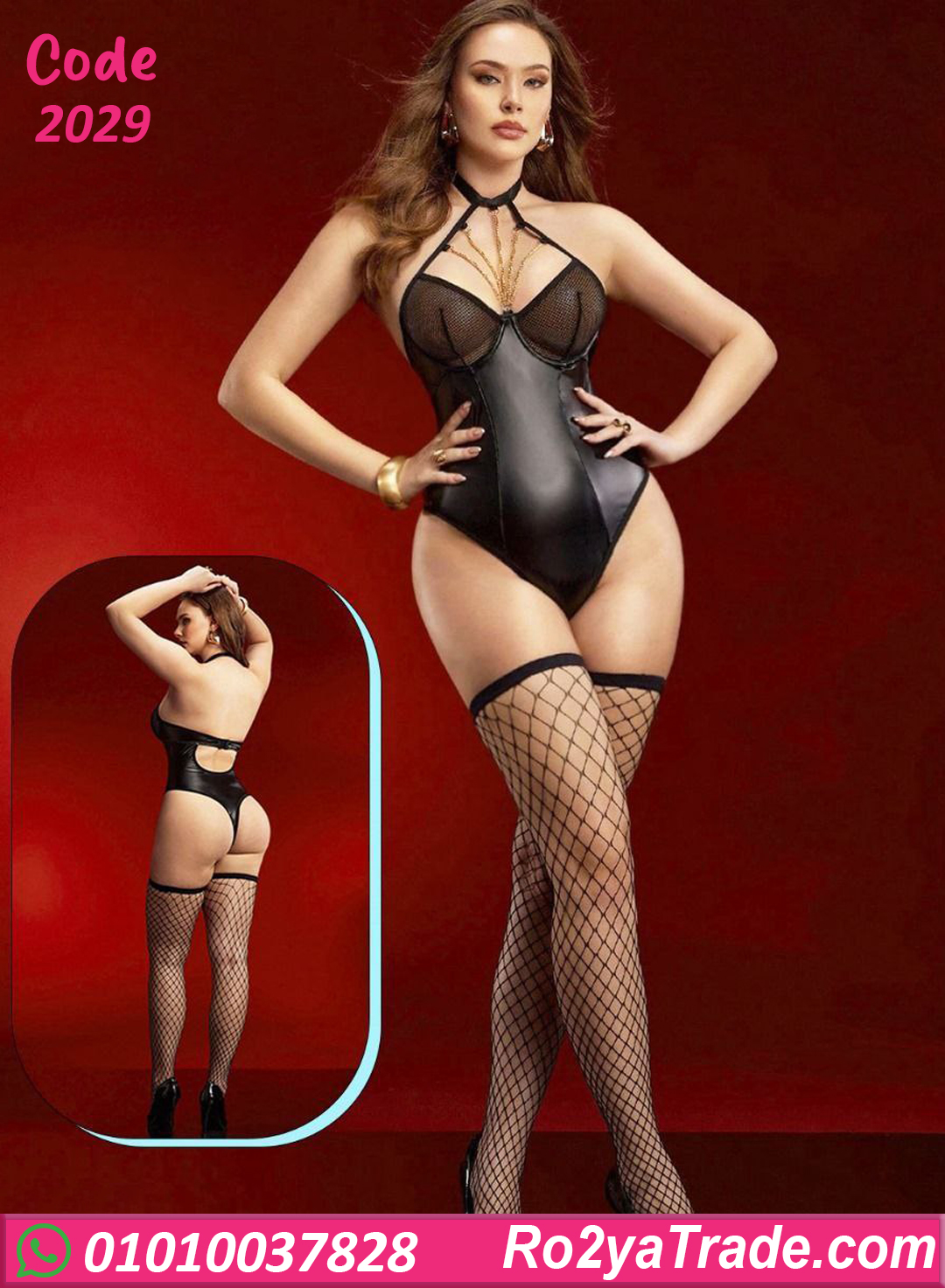 لانجري حريمي بتصميم جريء ومثير، خامة جلد لامع مع تفاصيل شبك وقلادة صدر بتدي شكل أنيق وجذاب، مناسب للسهرات الخاصة ولحظات الدلع.