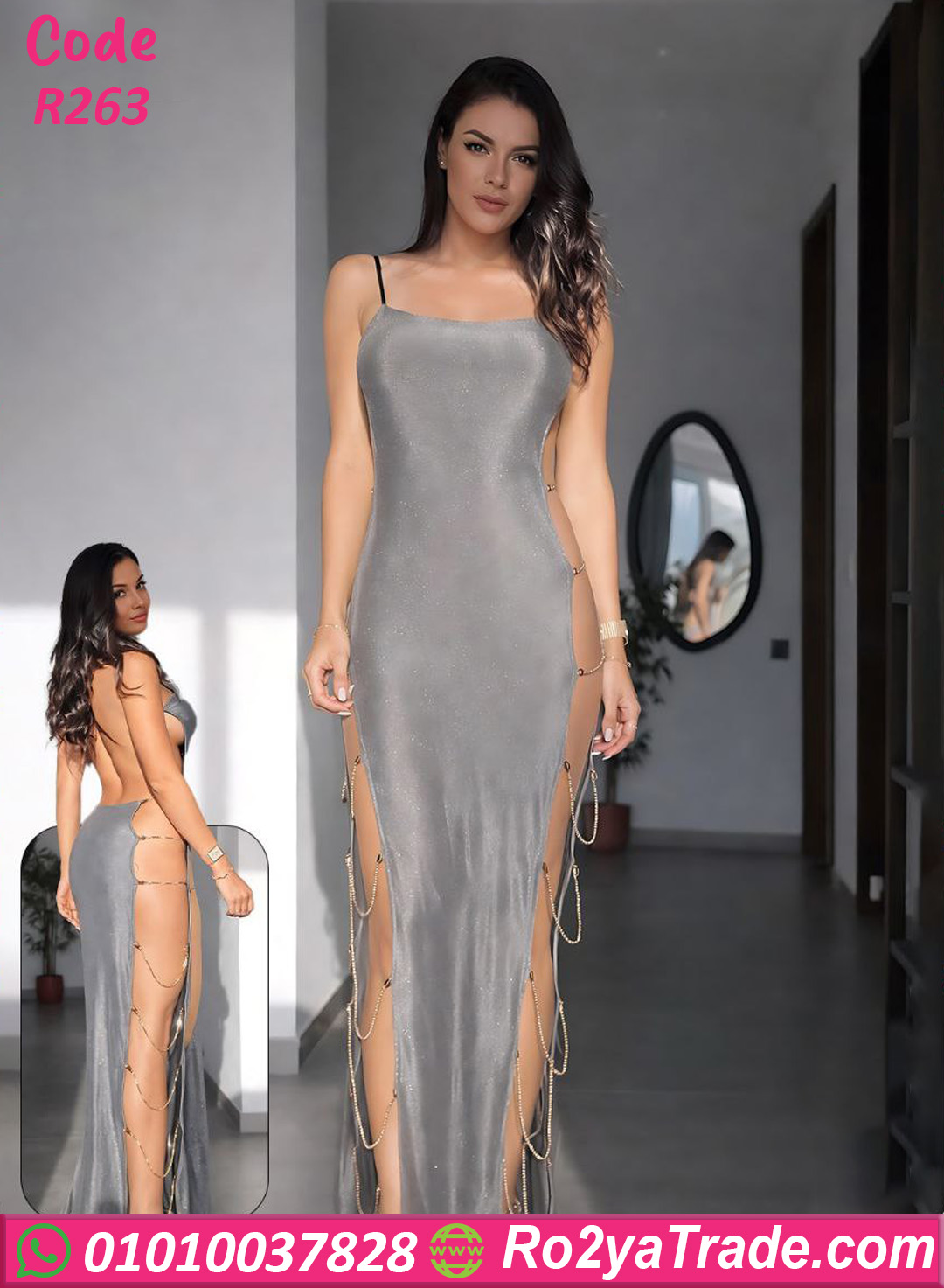 مع فتحات جانبية طويلة مزينة بسلاسل معدنية رفيعة بتدي لمسة فخامة وأنوثة مميزة. التصميم الضيق على الجسم بيبرز تفاصيل القوام بشكل جذاب ويخلي الإطلالة أكثر أناقة.