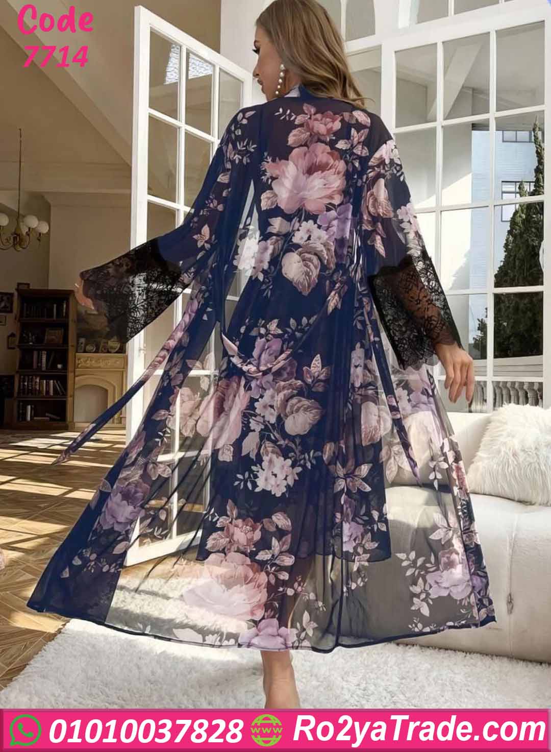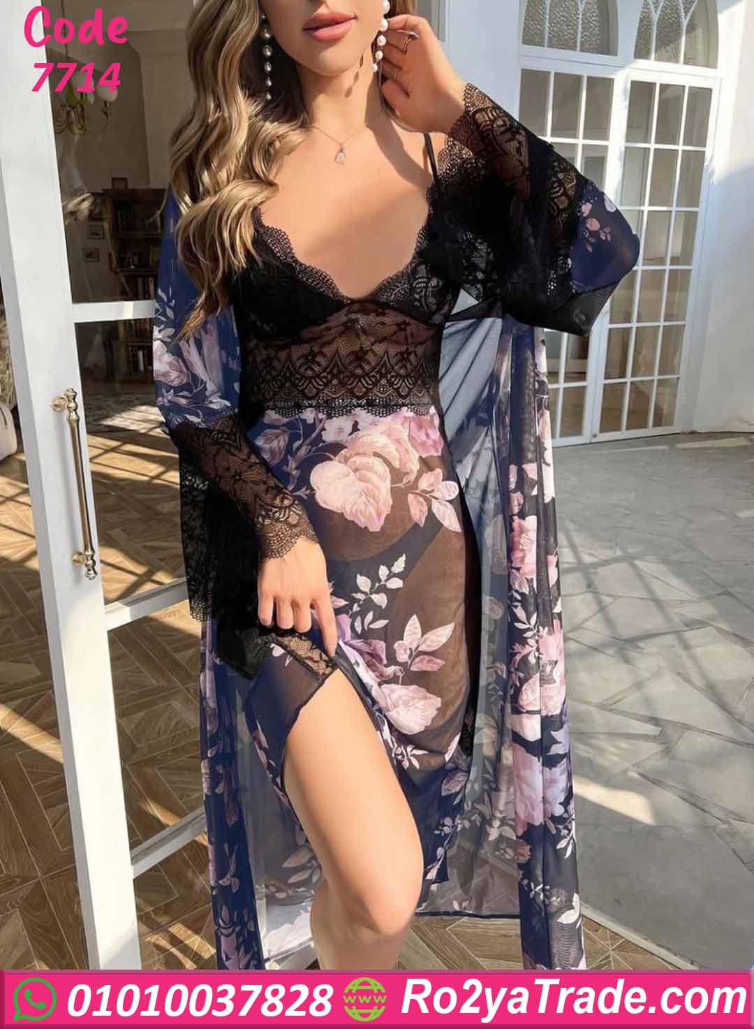 لانجري طويل 7714 من Lavida تصميم مميز مكوّن من قميص نوم شيفون شفاف بطبعة ورد ناعمة مع دانتيل أسود راقي عند الصدر والخصر.