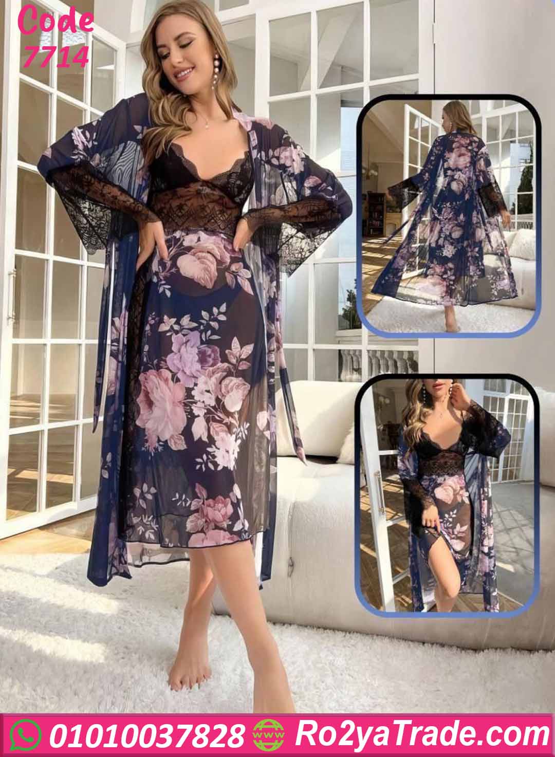 لانجري طويل بطبعة ورد مع روب شيفون أنيق يخلي إطلالتك راقية وناعمة جدًا 🌸👑