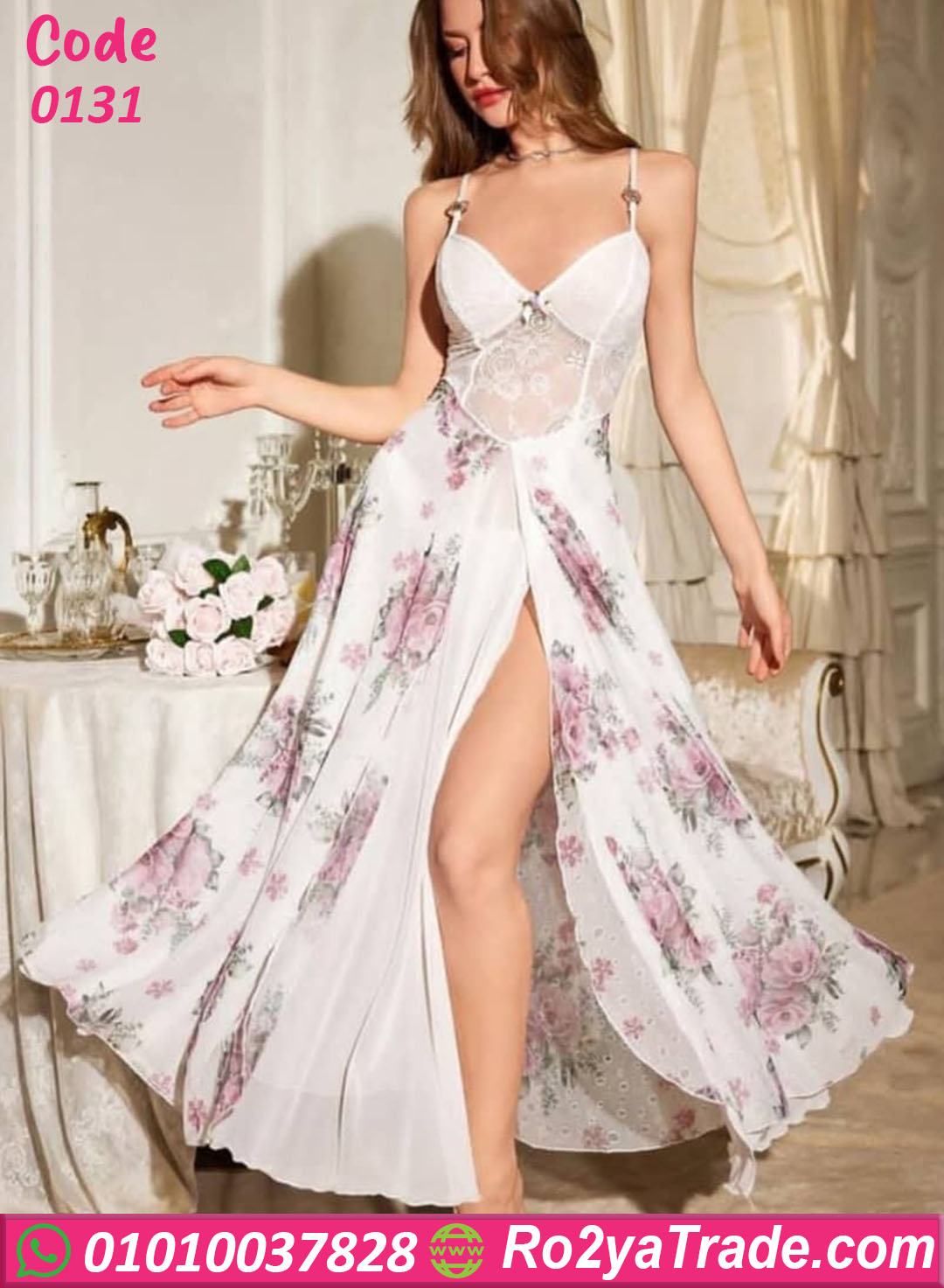 أما الجزء السفلي فيتميز بتصميم طويل واسع مزين بطبعات الورود الرقيقة التي تضيف لمسة رومانسية مميزة إلى التصميم، كما أن الفتحة الأمامية تمنح اللانجري شكل جذاب وأنثوي.