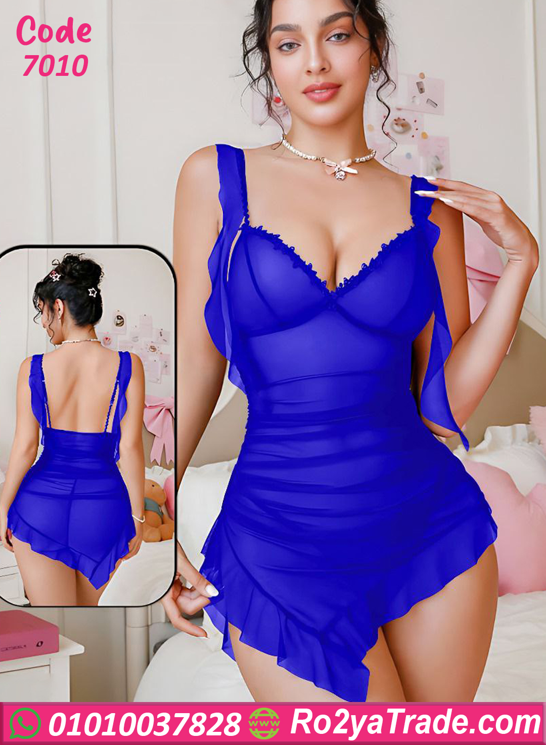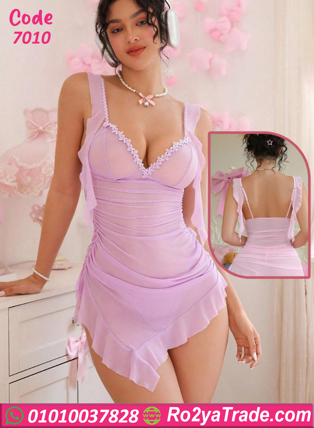 لانجري شيفون ناعم بخامة خفيفة ومريحة على الجسم، التصميم فيه لمسات بسيطة من الدانتيل على منطقة الصدر، مع قصة مجمعة بتدي شكل أرفع ومنسق.