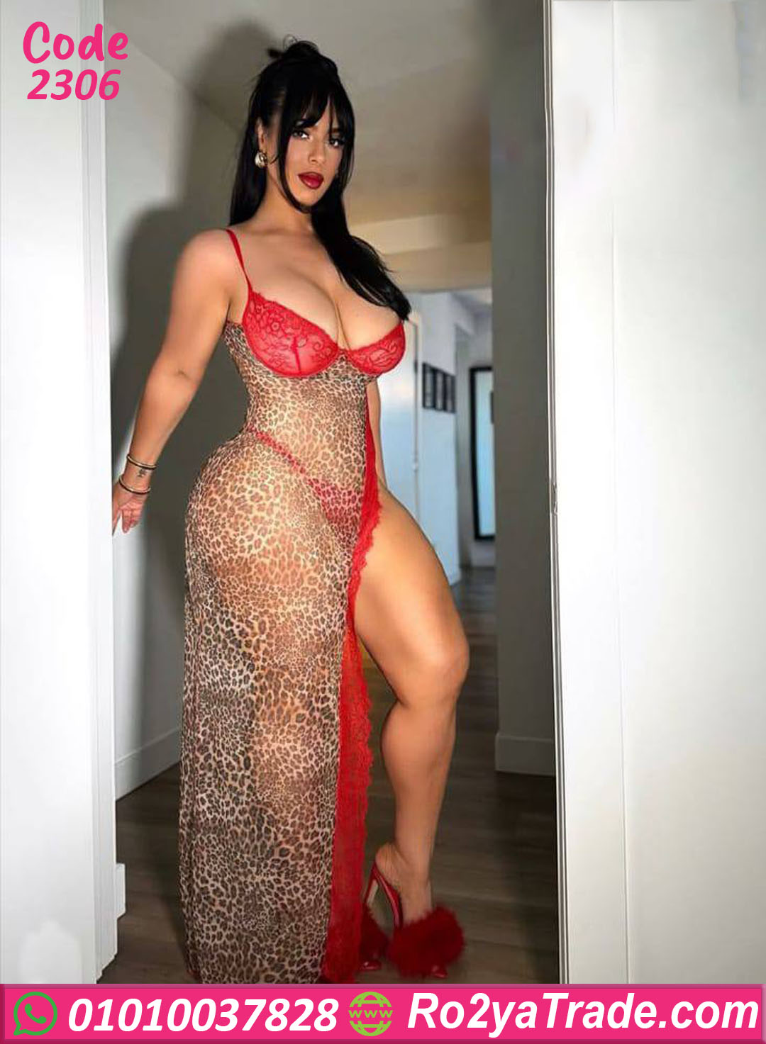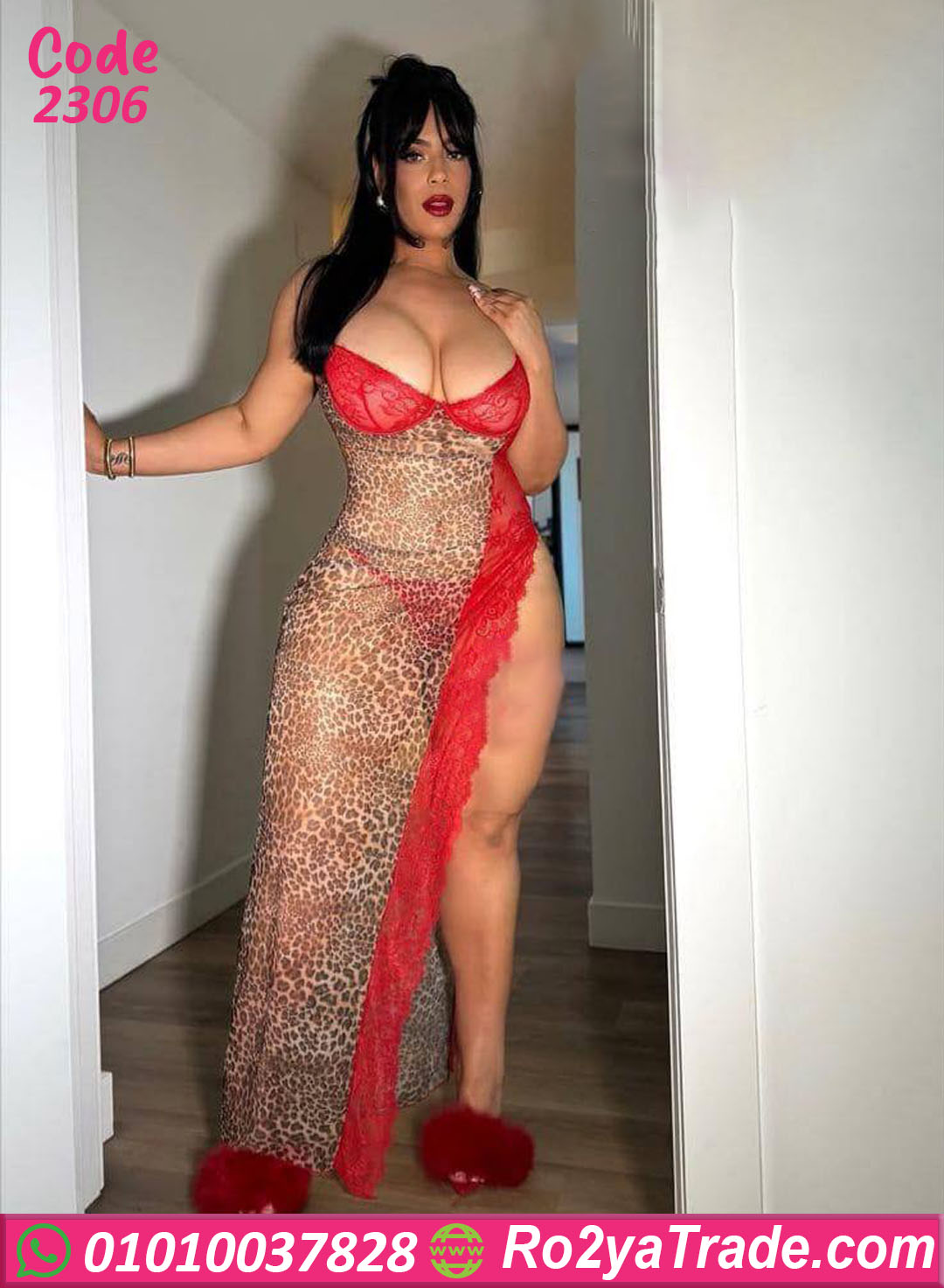 لانجري طويل بتصميم جريء ومثير، خامته شبك مطبوع بنقشة التايجر مع تفاصيل دانتيل باللون الأحمر بتدي إحساس قوي بالفخامة والجاذبية.