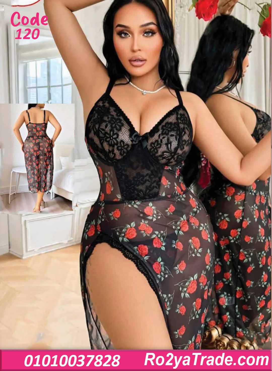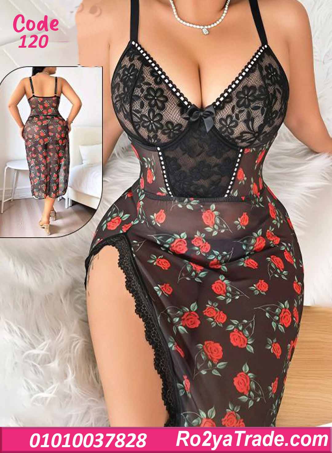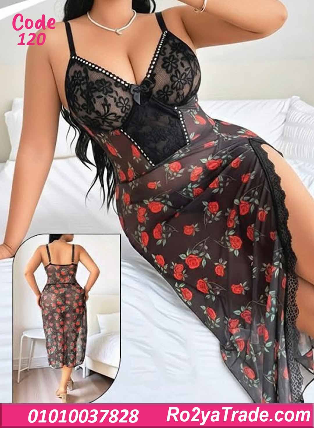 لانجري طويل بتصميم رومانسي جريء، يجمع بين الدانتيل الأسود ونقشة الورد الأحمر بشكل يخطف القلب 🌹🖤