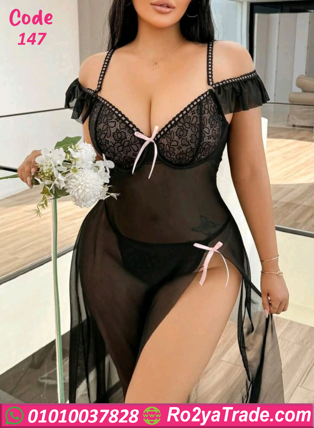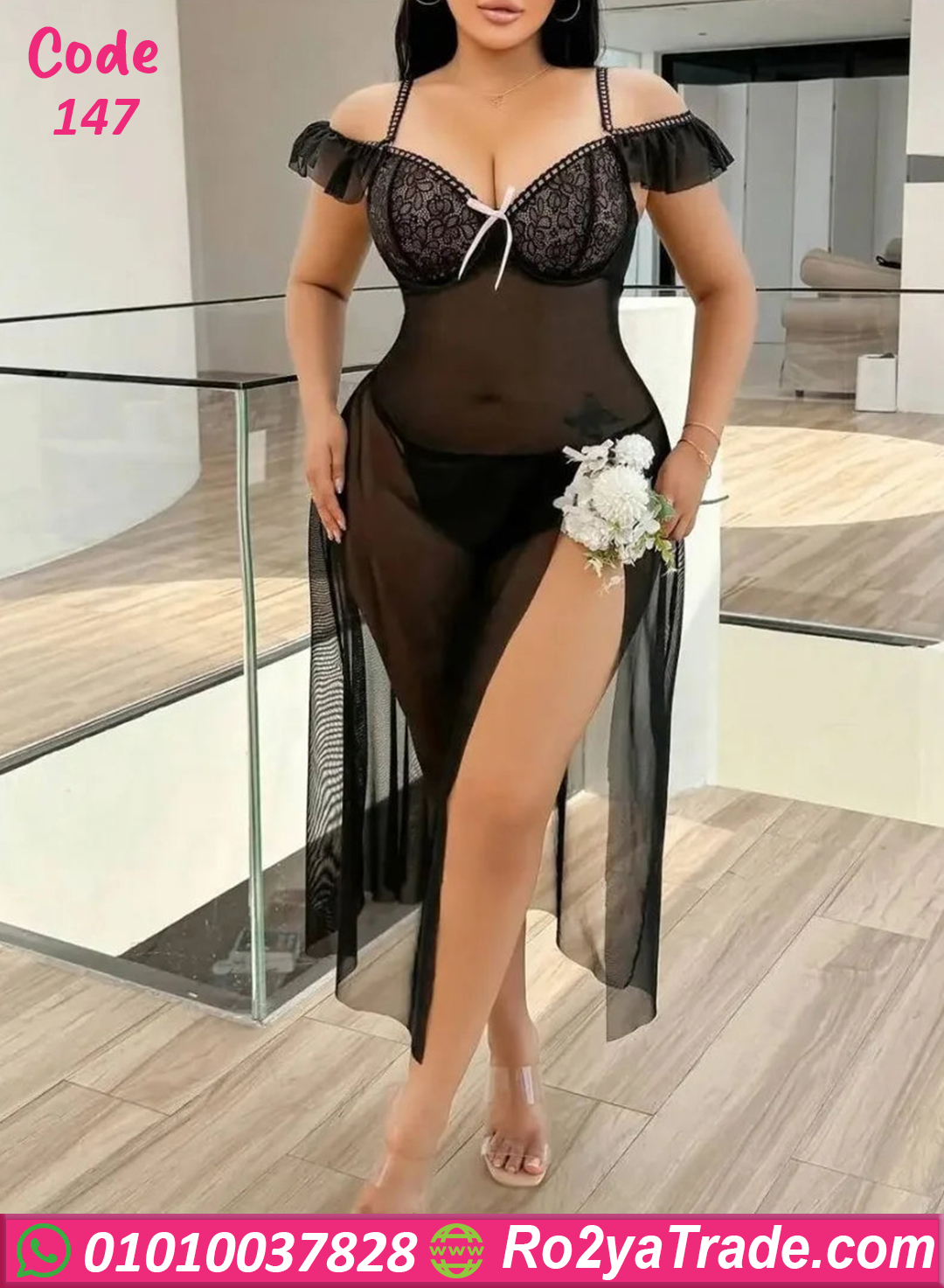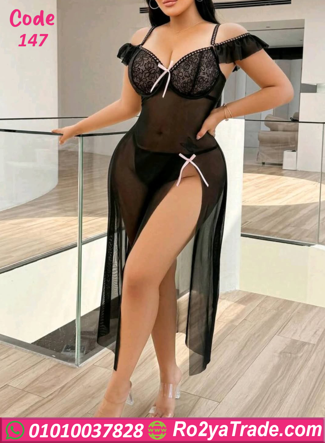 لانجري طويل بتصميم جريء وأنثوي، خامته ناعمة وشفافة بتبرز القوام بشكل جذاب وراقي، مع تفاصيل دانتيل ولمسات بسيطة بتدي إحساس بالفخامة والثقة.