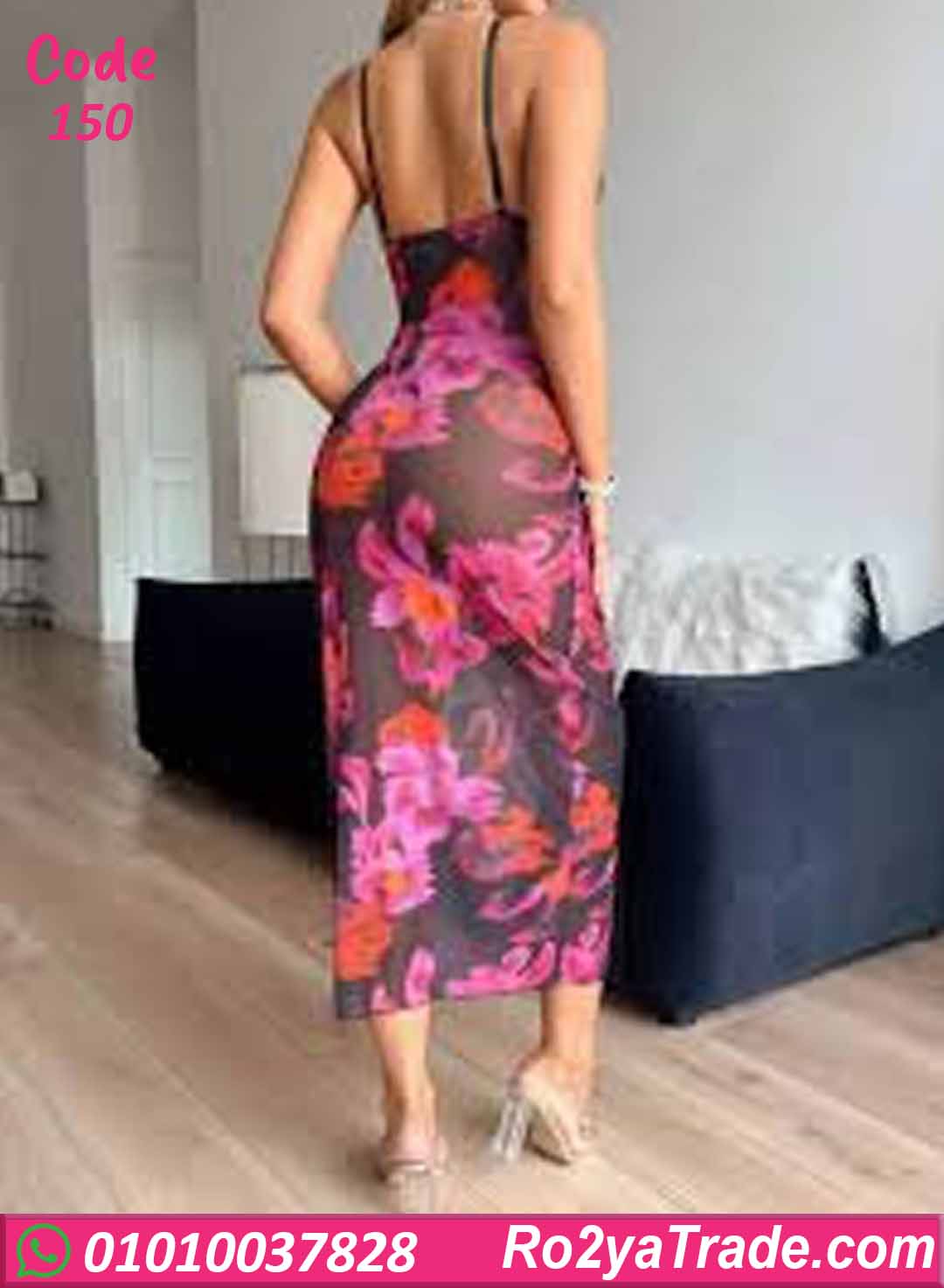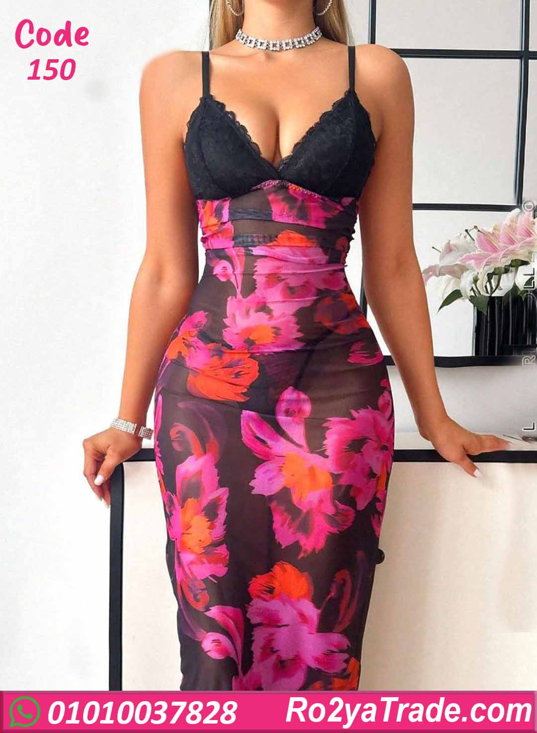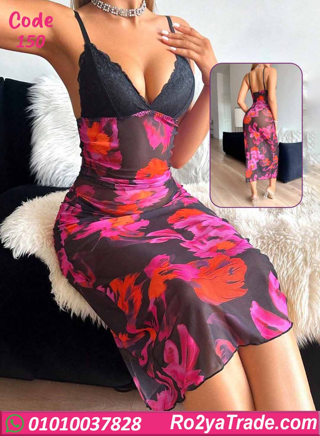قصة انسيابية مع خامة شفافة مطبوعة بنقشة ورود بتدي شكل أنثوي جذاب، مع صدر دانتيل يبرز جمال القَصّة، مناسب للسهرات الخاصة ولحظات الدلع.