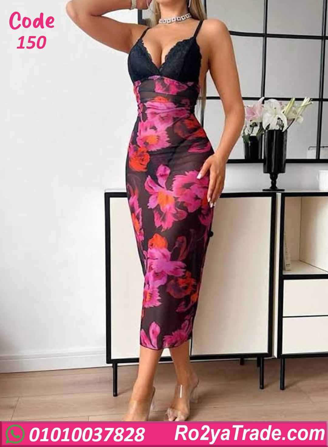 التصميم مميز بقصة صدر دانتيل جذابة مع جسم طويل بنقشة ورود أنيقة،