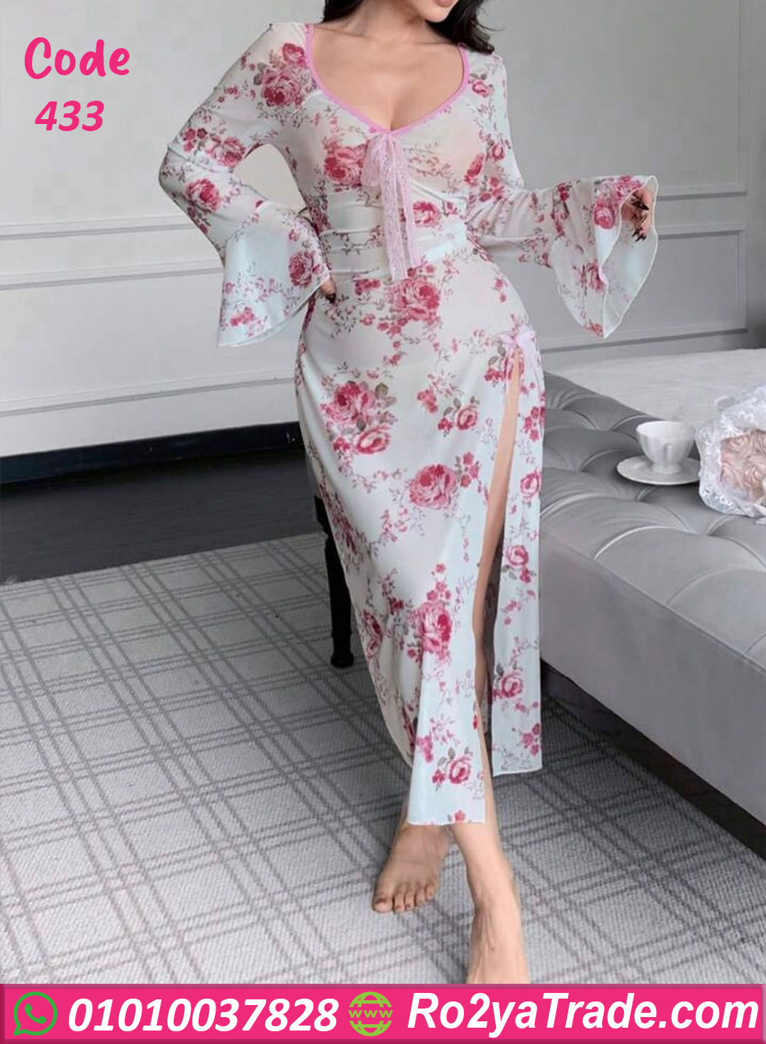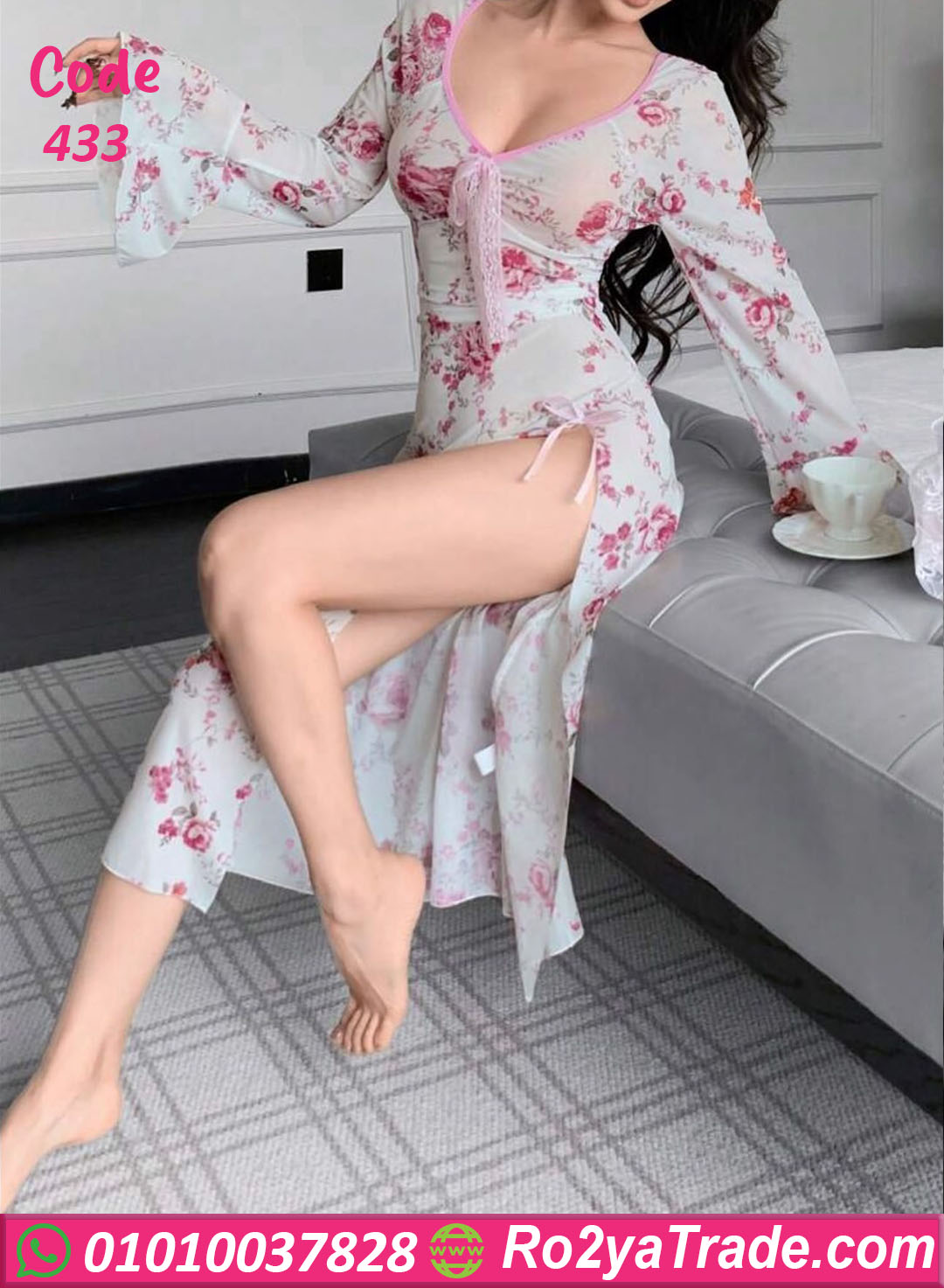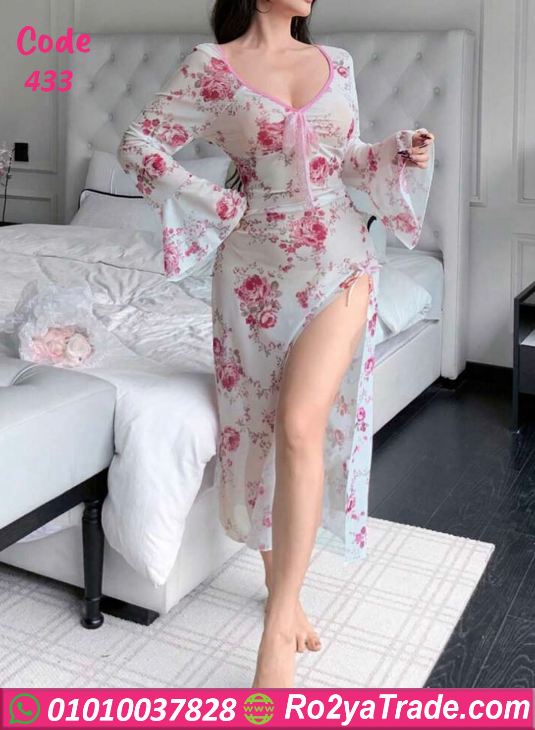 لانجري طويل ستايل ناعم بطبعة ورد، تصميم مفتوح من الجنب بشريطة رقيقة تضيف لمسة دلع وأنوثة 💕