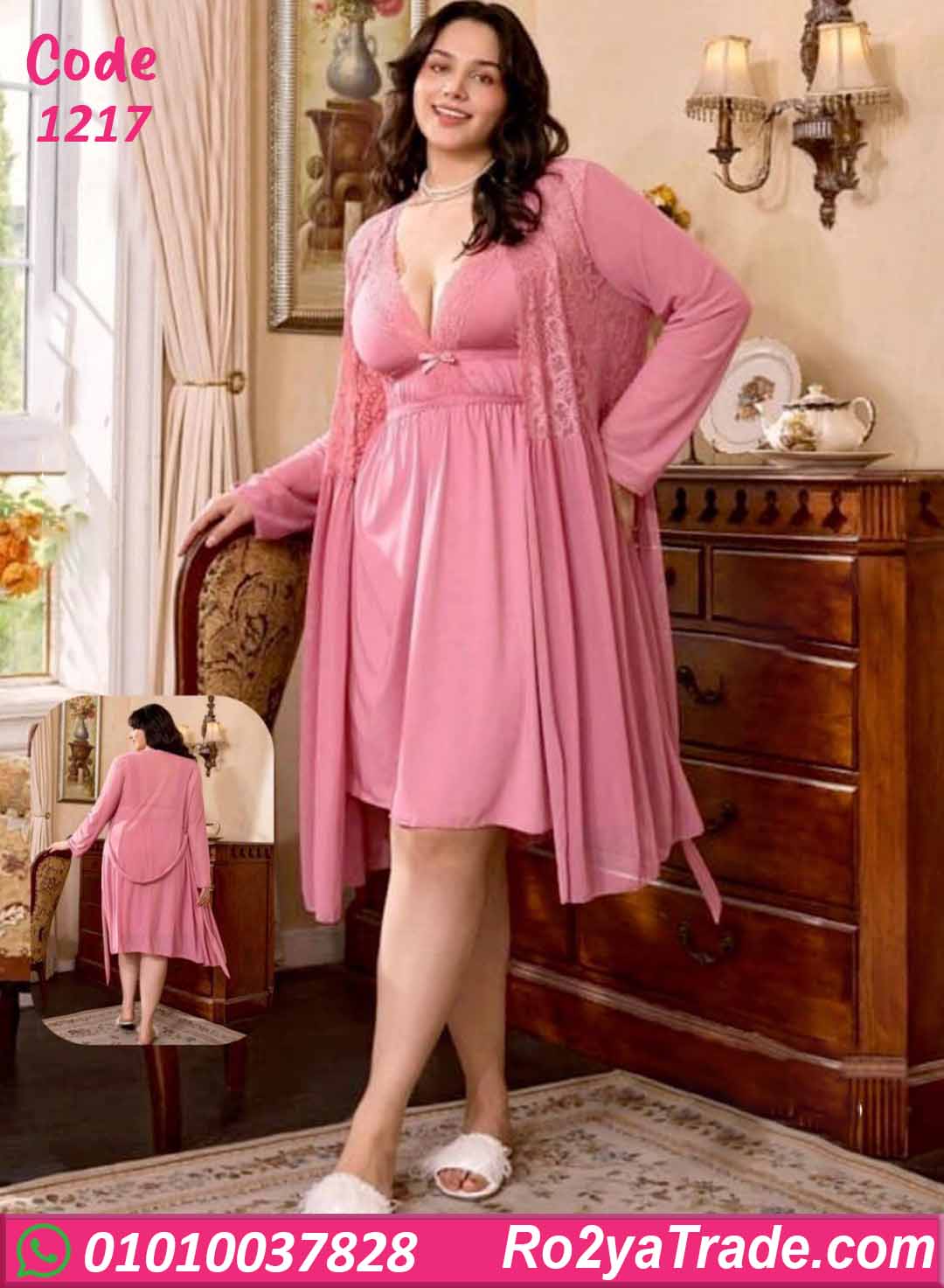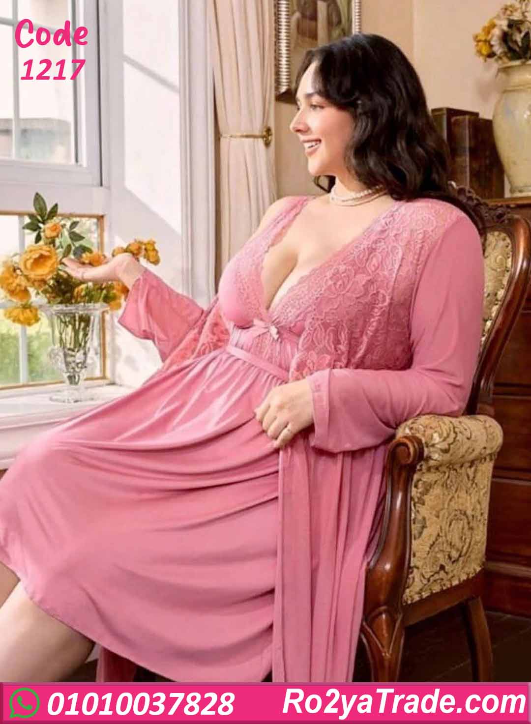 تصميم أنثوي ناعم بلون وردي جذاب مع دانتيل على الصدر والروب بيضيف لمسة شيك وراقية تخلي الطقم مثالي للبيت وللأوقات الخاصة.