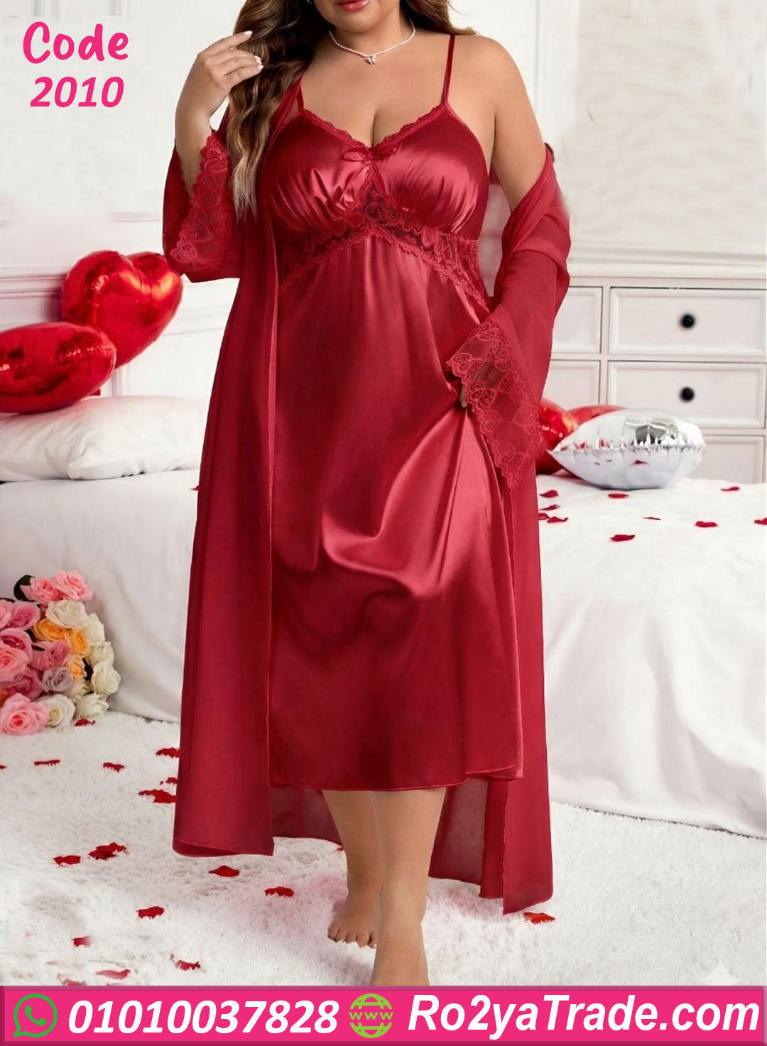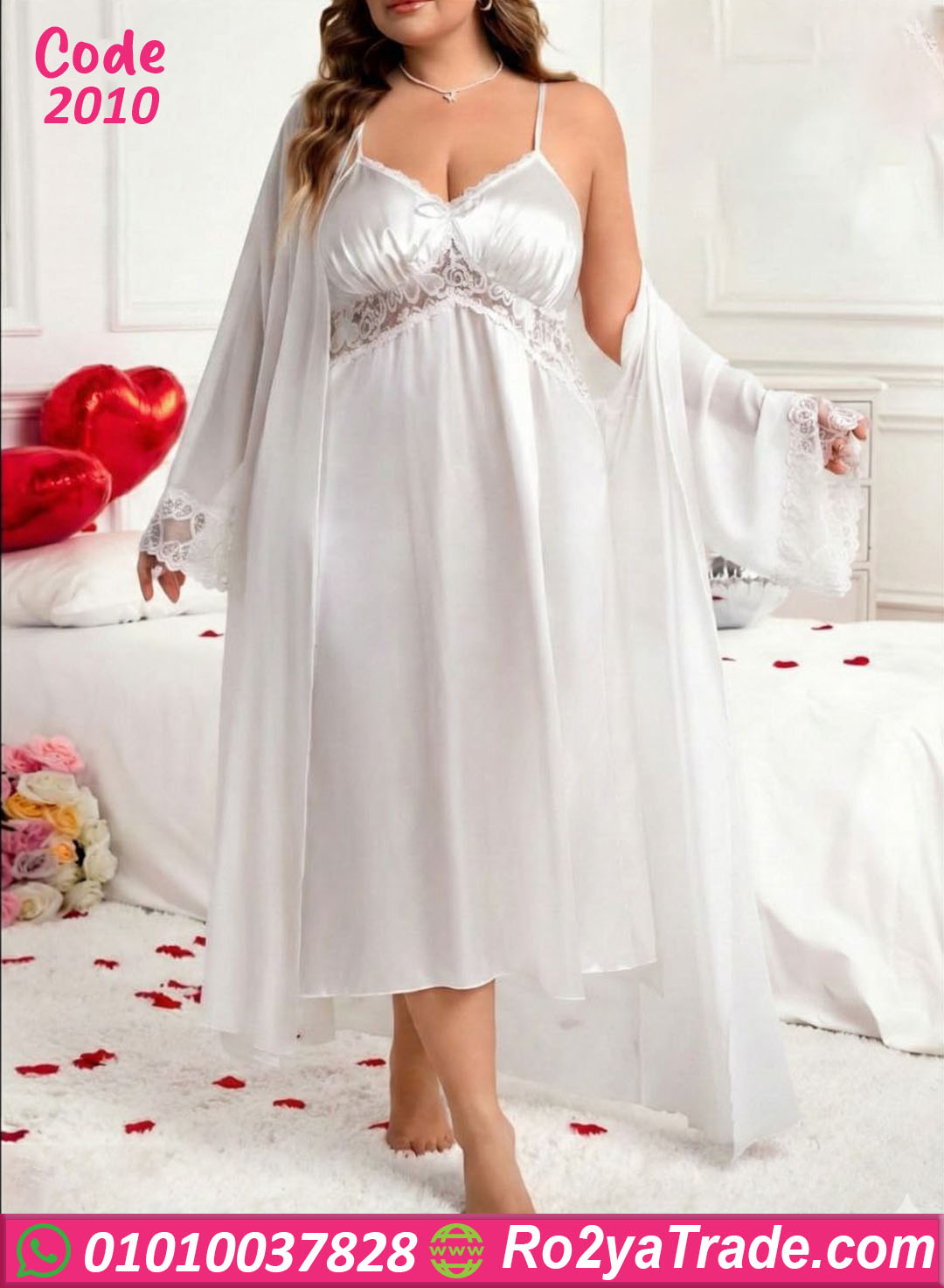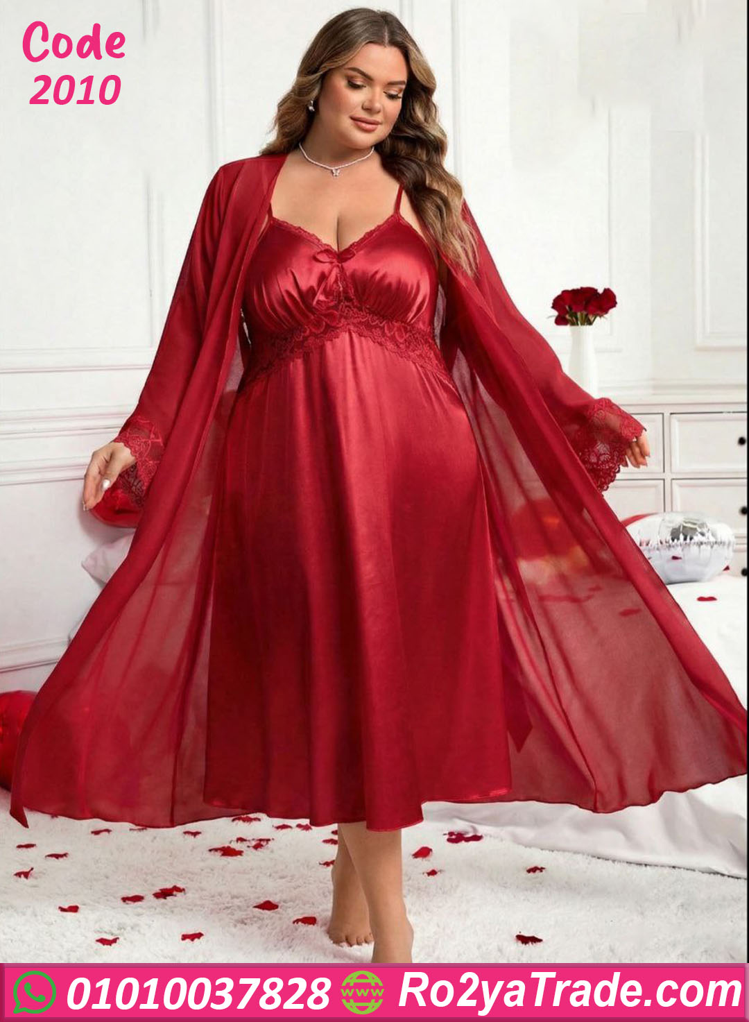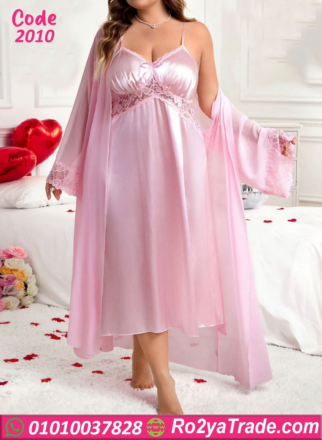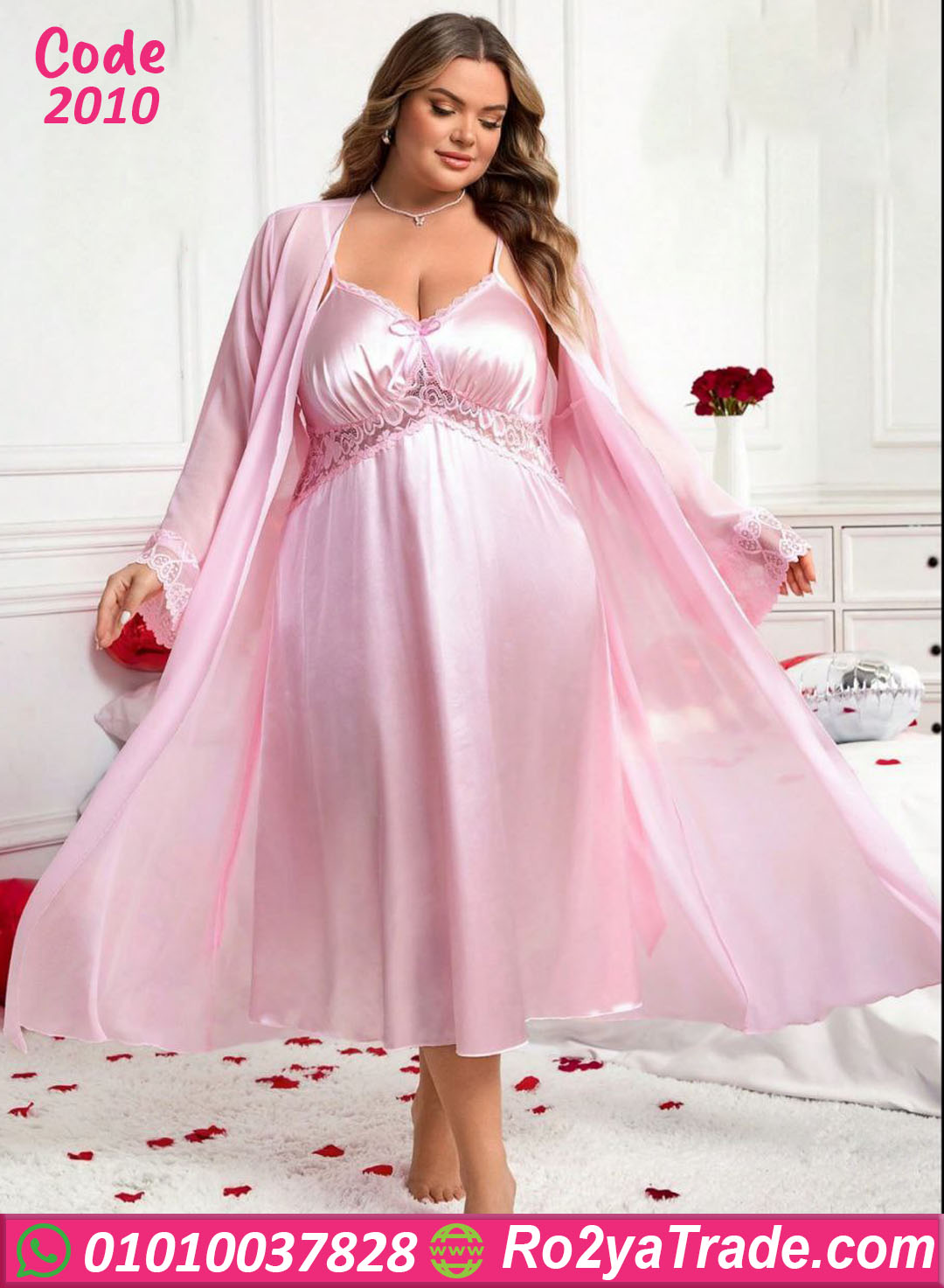 لانجري حريمي قصير بخامة ستان ناعمة ولامعة مع روب شيفون خفيف، تصميم أنثوي شيك بلمسة دانتيل عند الصدر، مناسب للبيج سايز ويدي شكل راقي ومثير في نفس الوقت.