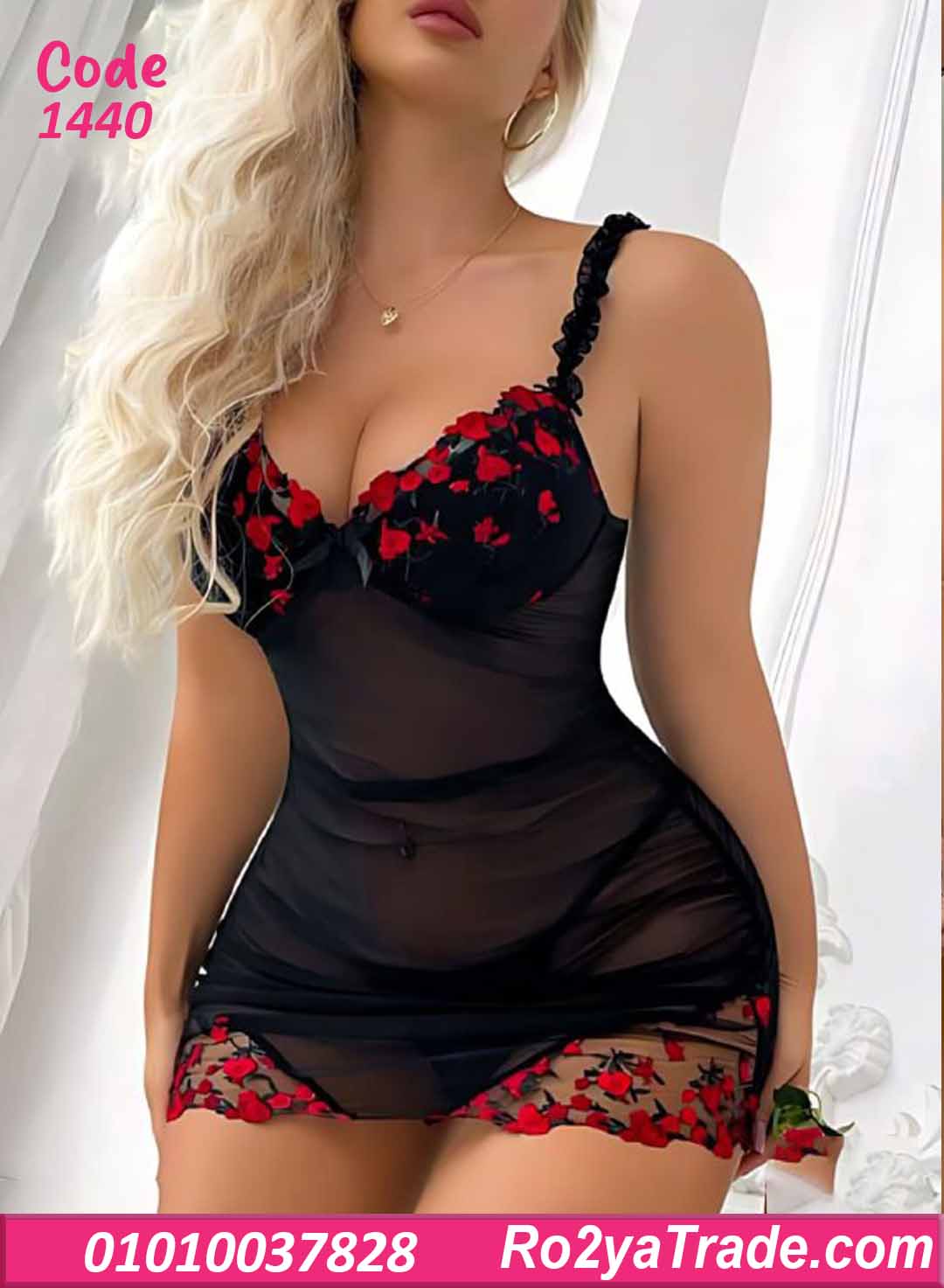 لانجري قصير بتصميم أنثوي رقيق، مزيج بين الشيفون الشفاف وتفاصيل ورد أحمر بارزة بتدي لمسة رومانسية جذابة ومميزة.