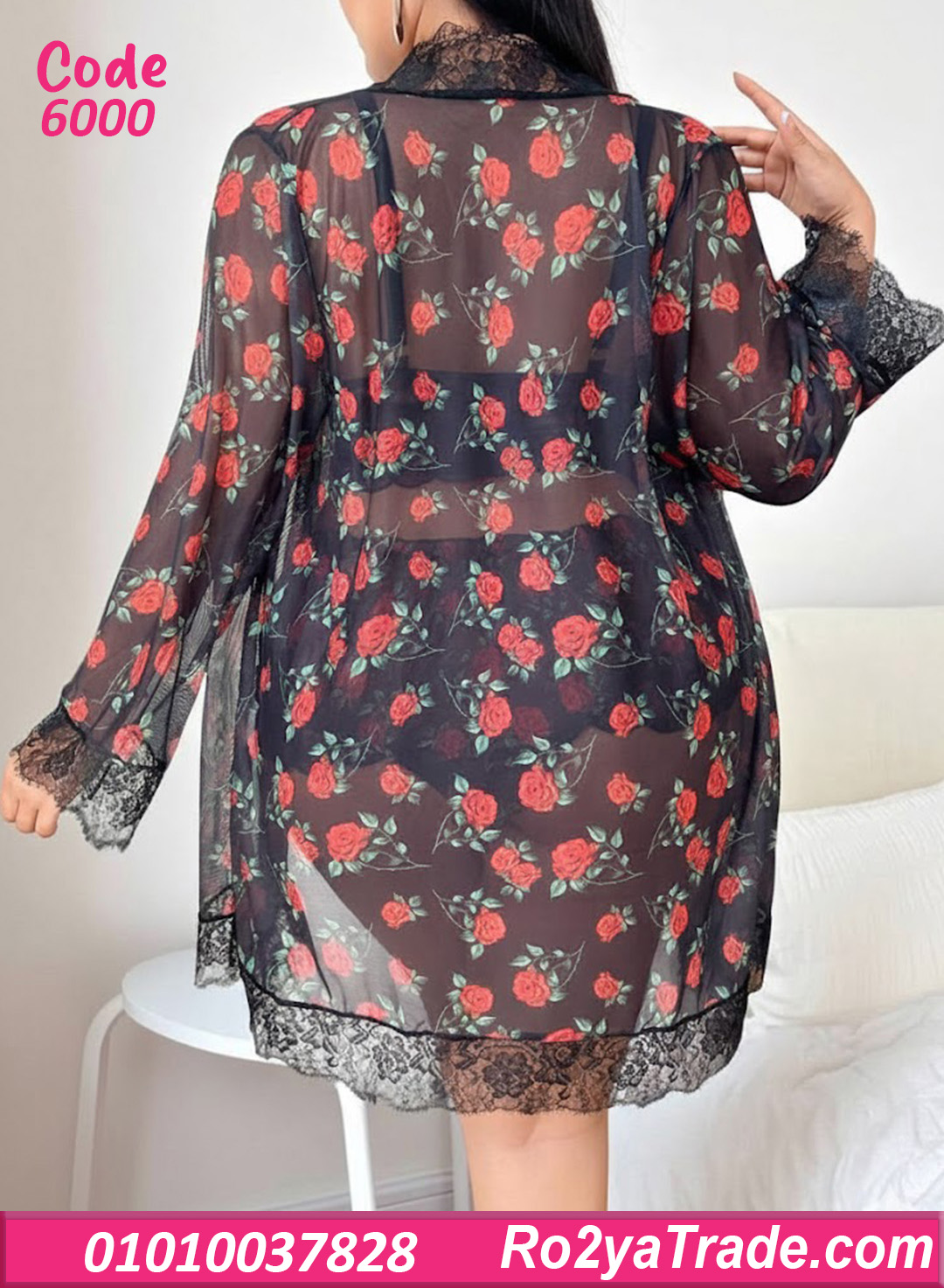 ✔️ روب شيفون شفاف بطبعة ورد أحمر جذابة، بأكمام واسعة ولمسة دانتيل على الأطراف.