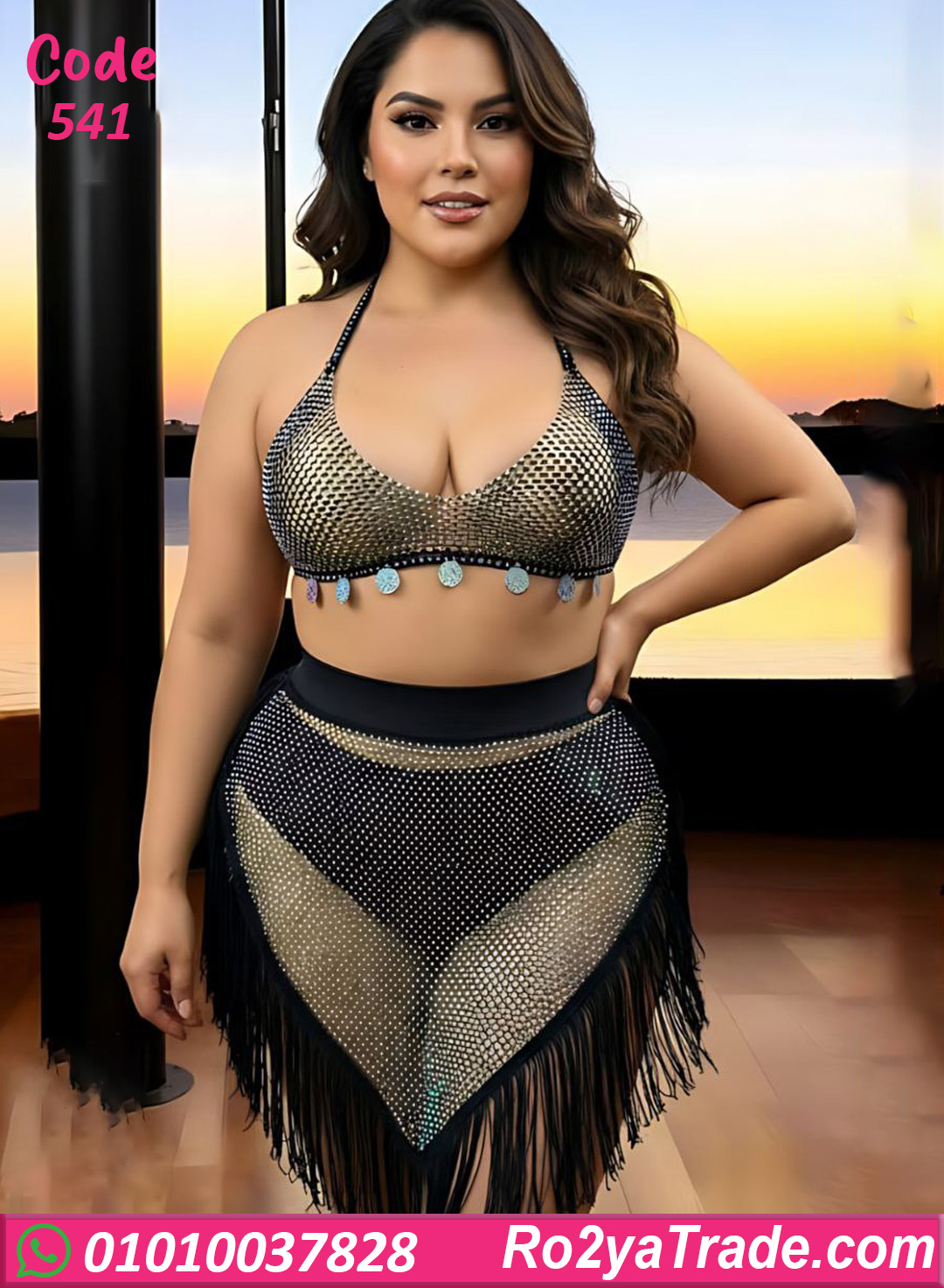 لانجري ميني جيب شبك بتصميم جريء وأنيق، مكوّن من قطعتين (توب + ميني جيب) ومزين بستراس لامع يعطي لمسة فخامة وجاذبية، مناسب للسهرات الخاصة والإطلالات المميزة.