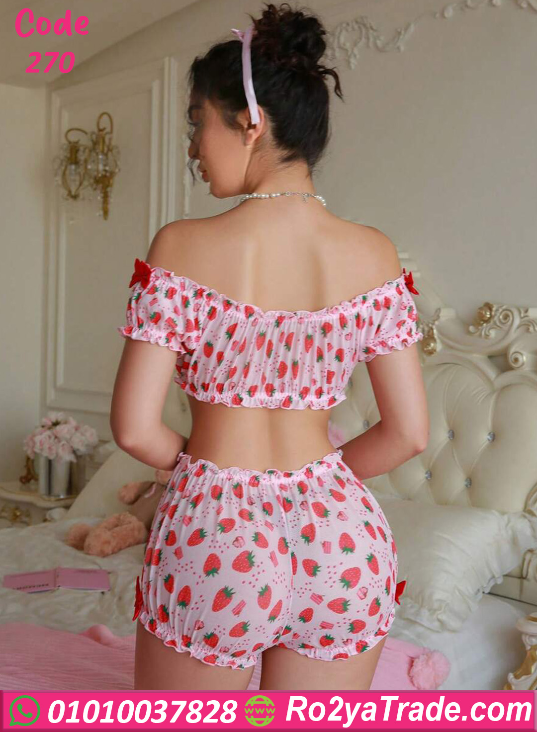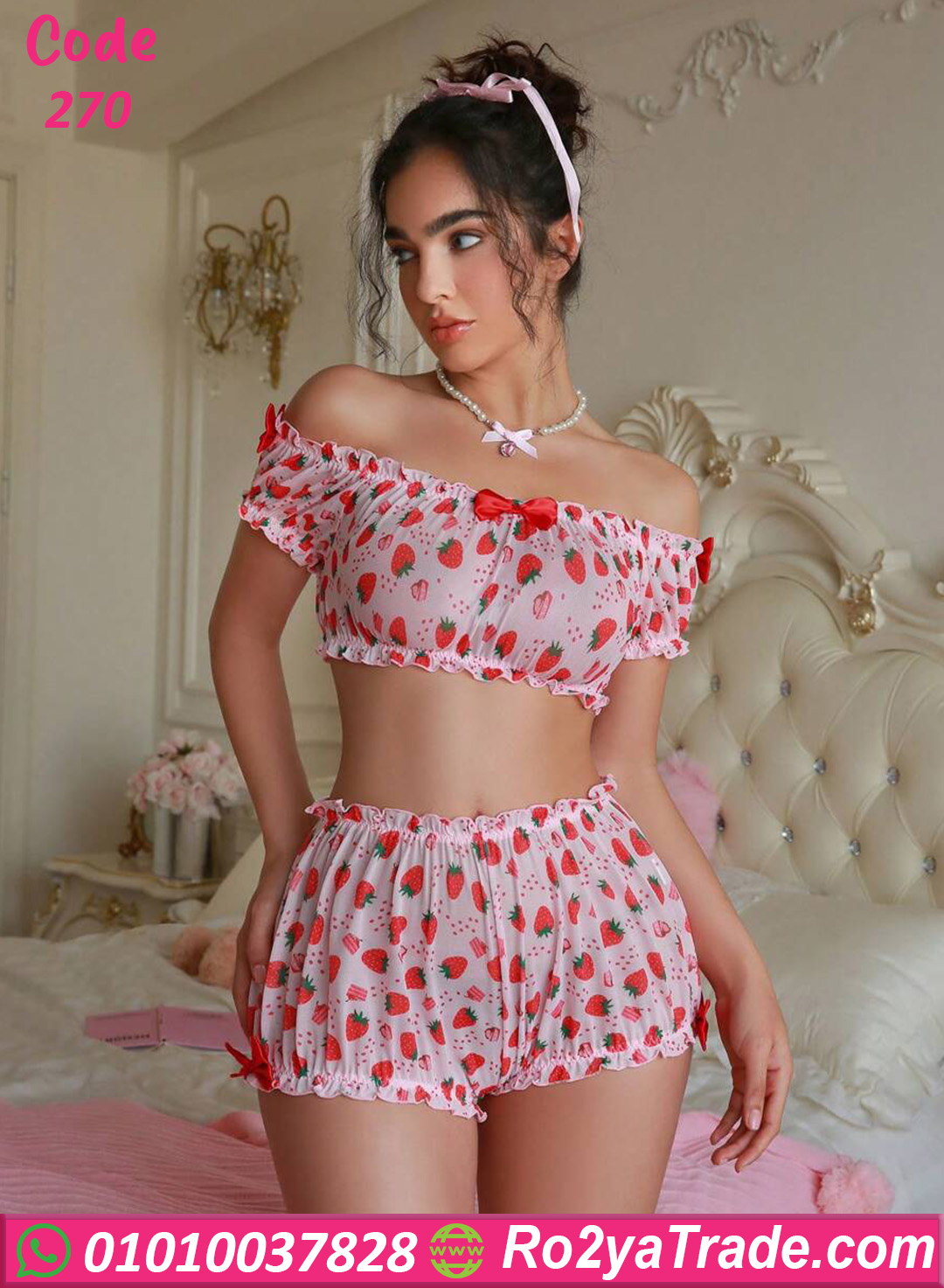 لانجري كود 270 من ماركة Fionka بتصميم أنيق وناعم يجمع بين الجاذبية والأنوثة. يتميز التصميم بنقشة الفراولة اللطيفة مع تفاصيل كشكشة رقيقة تضيف لمسة أنثوية جذابة.