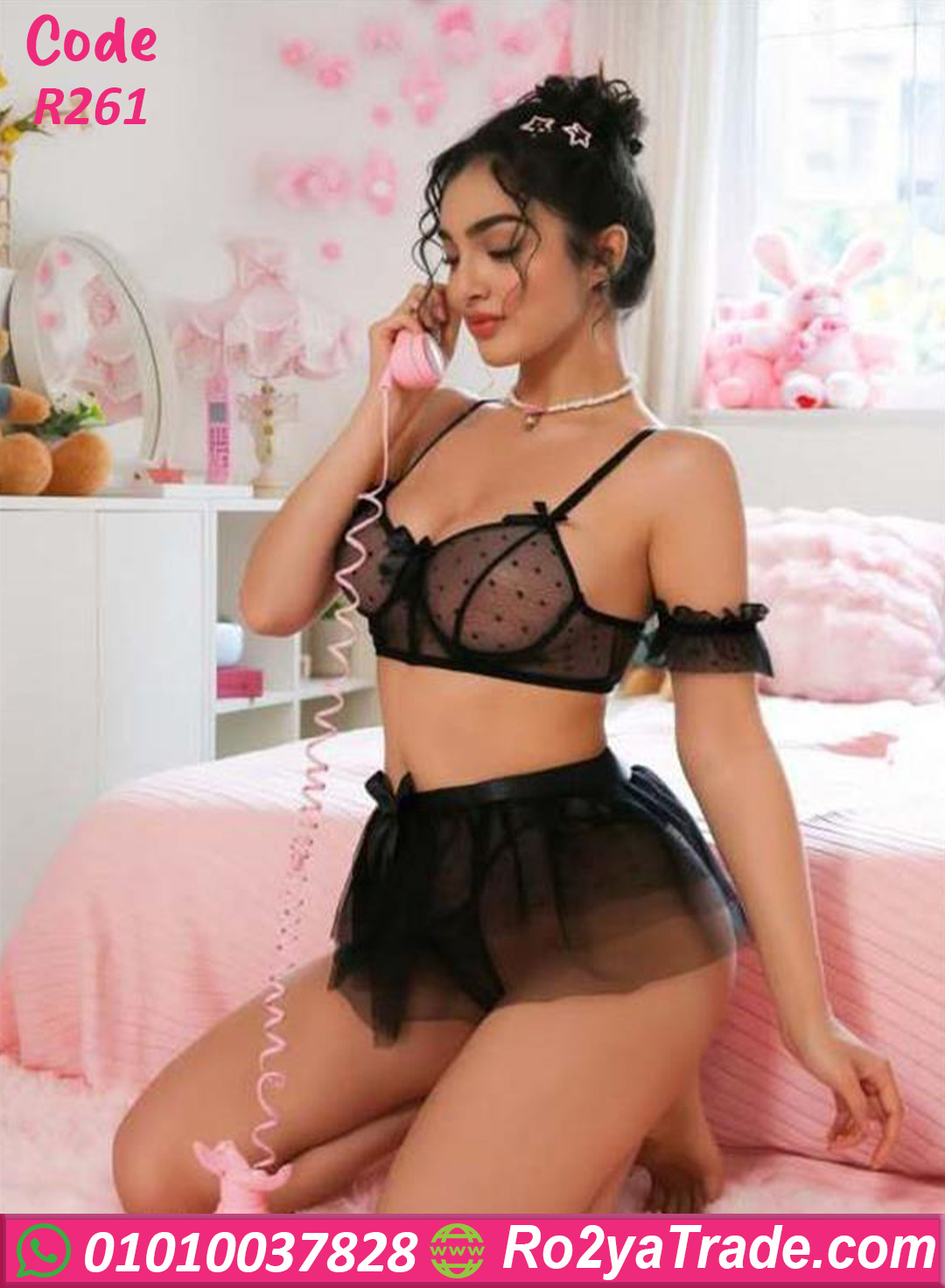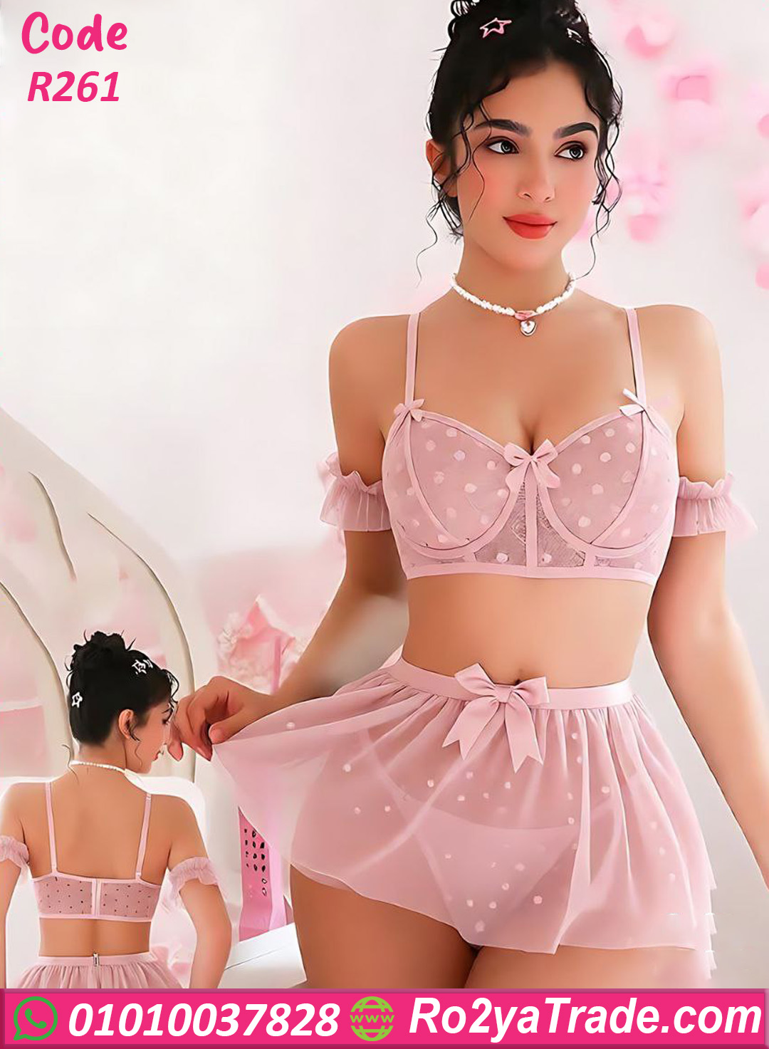 لانجري نسائي مميز بتصميم أنثوي جذاب يجمع بين الرقة والجرأة في نفس الوقت. الموديل عبارة عن طقم لانجري ميني جيب بخامة شفافة ناعمة مع تصميم نقاط بولكا دوت أنيقة،