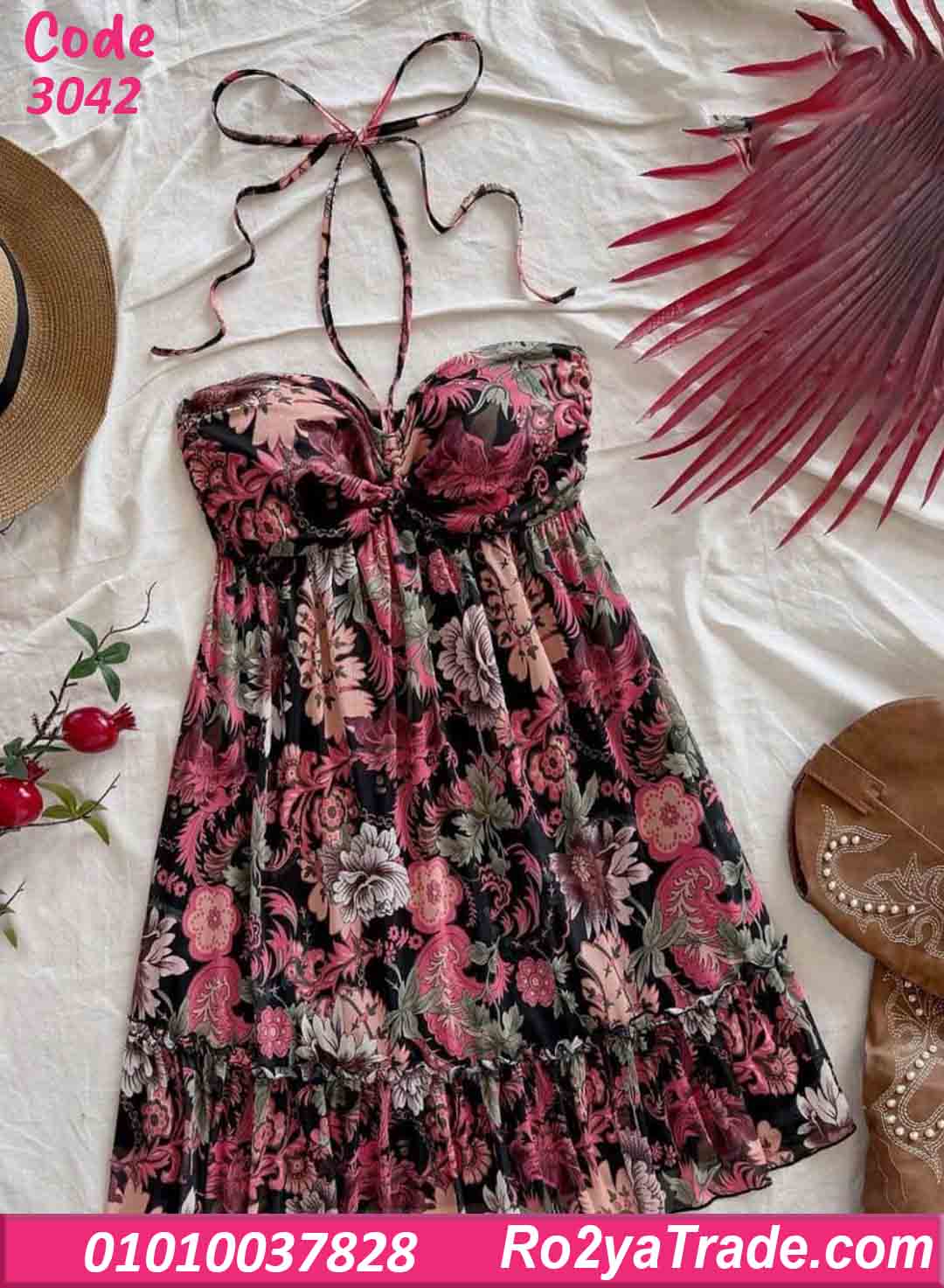 ، يتميز بنقشة ورد ملونة تضيف لمسة أنثوية ناعمة. يأتي الموديل بقصة صدر مميزة مع حمالات رفيعة تُربط خلف