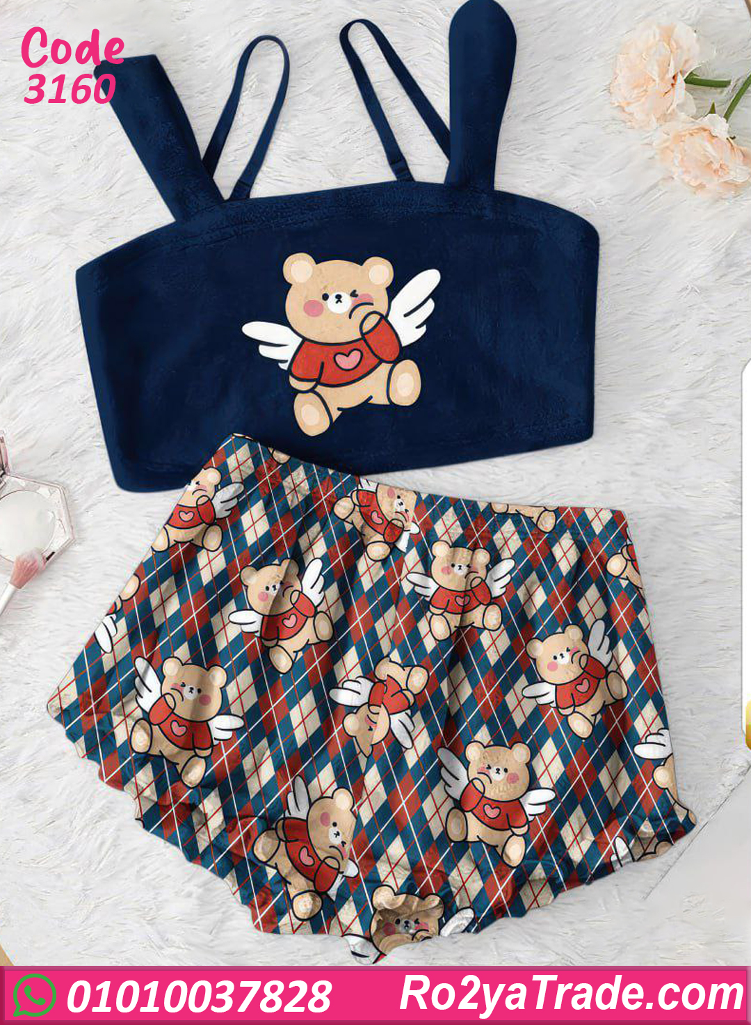 التصميم مكوّن من توب كت برسمة دبدوب لطيف مع هوت شورت مريح بنفس النقشة، بيدي شكل شبابي ومرح من غير مبالغة.