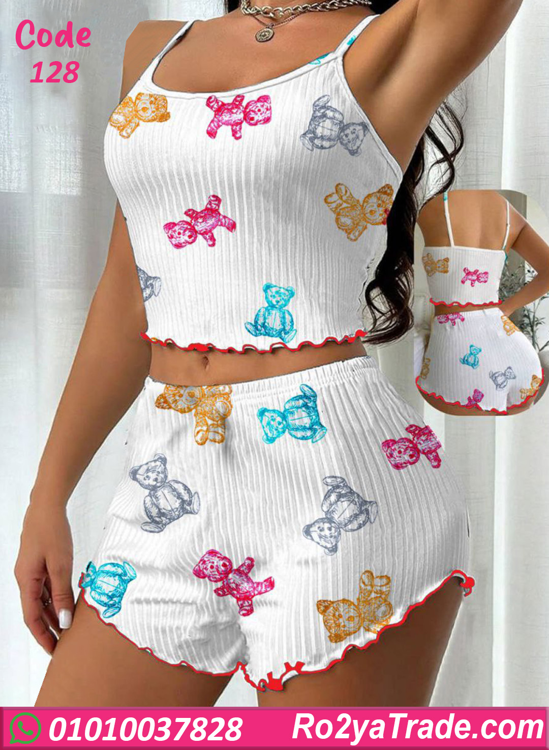 هوت شورت حريمي صيفي مكوّن من توب وشورت بنقشة دبدوب لطيفة، تصميم مريح وخفيف مناسب للبس اليومي في البيت، بيدي إحساس بالراحة والانتعاش في الحر.