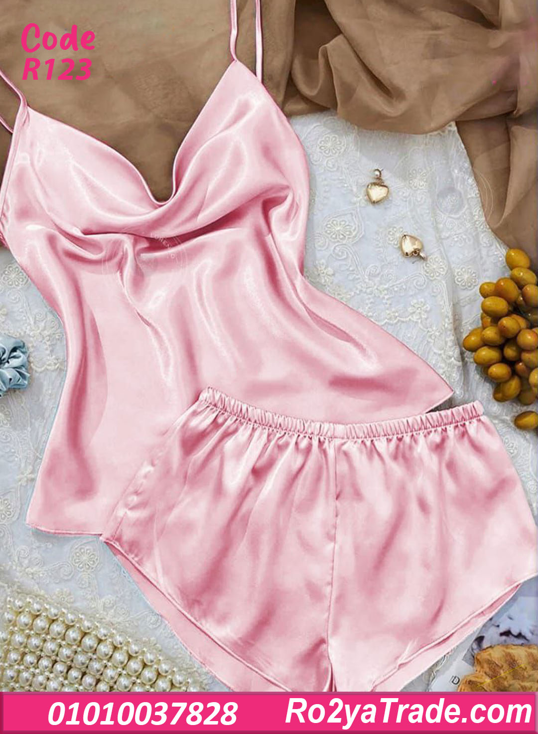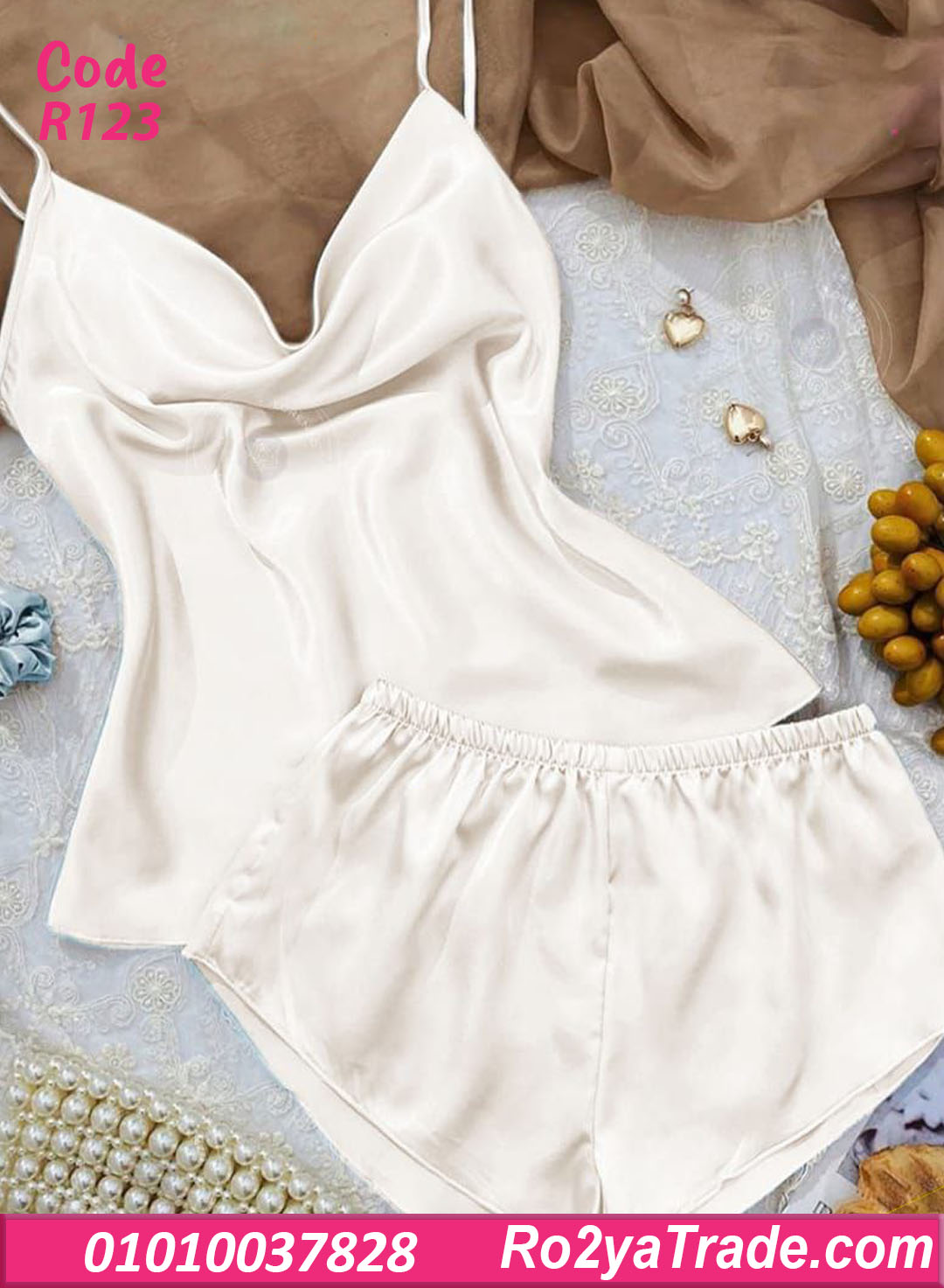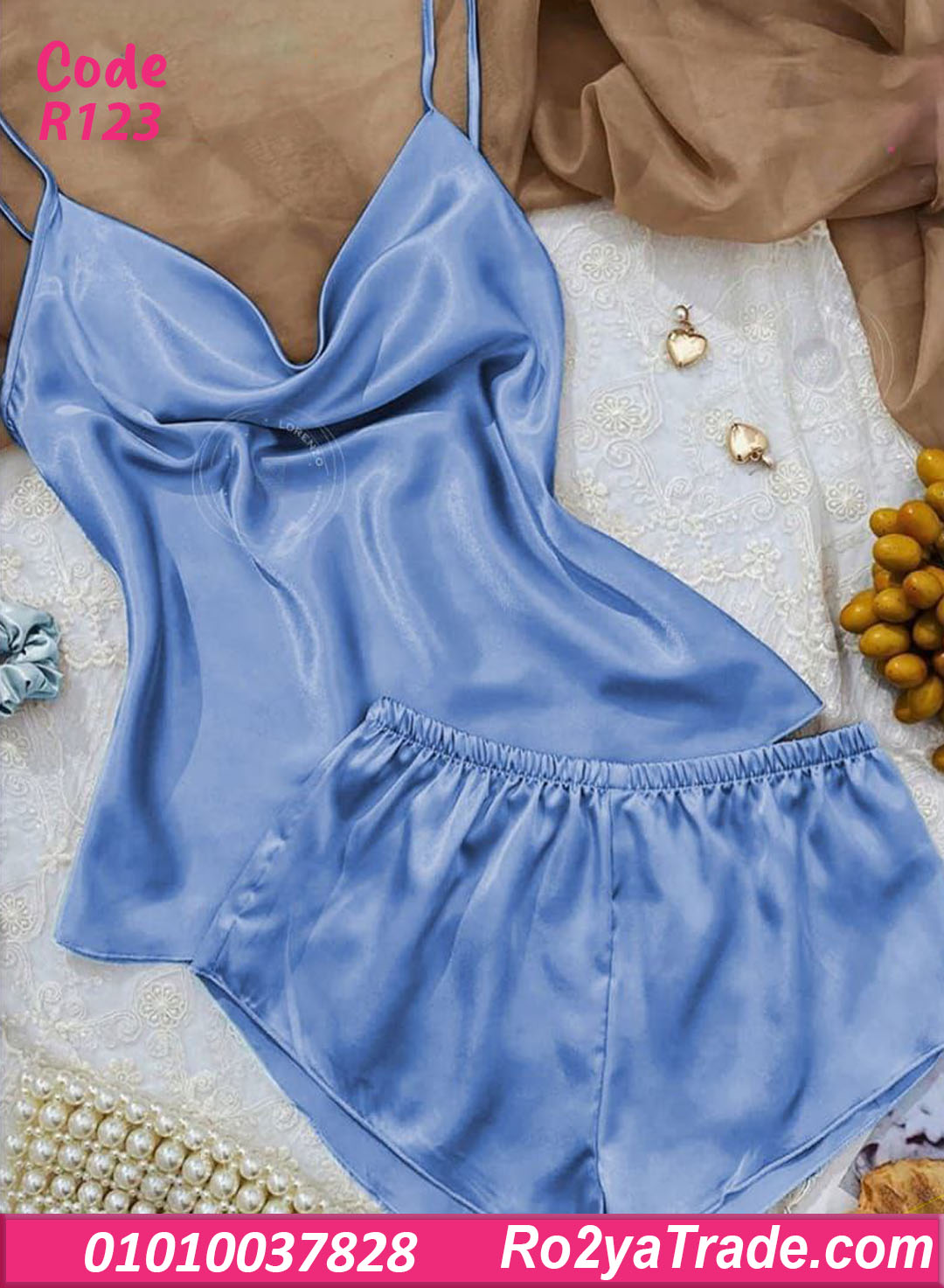 طقم كود R123 مكون من: ✔️ توب بحمالات رفيعة بقصة صدر انسيابية (ستايل كاول) بتدي شكل ناعم وأنثوي. ✔️ شورت قصير بوسط مطاطي مريح على الجسم.