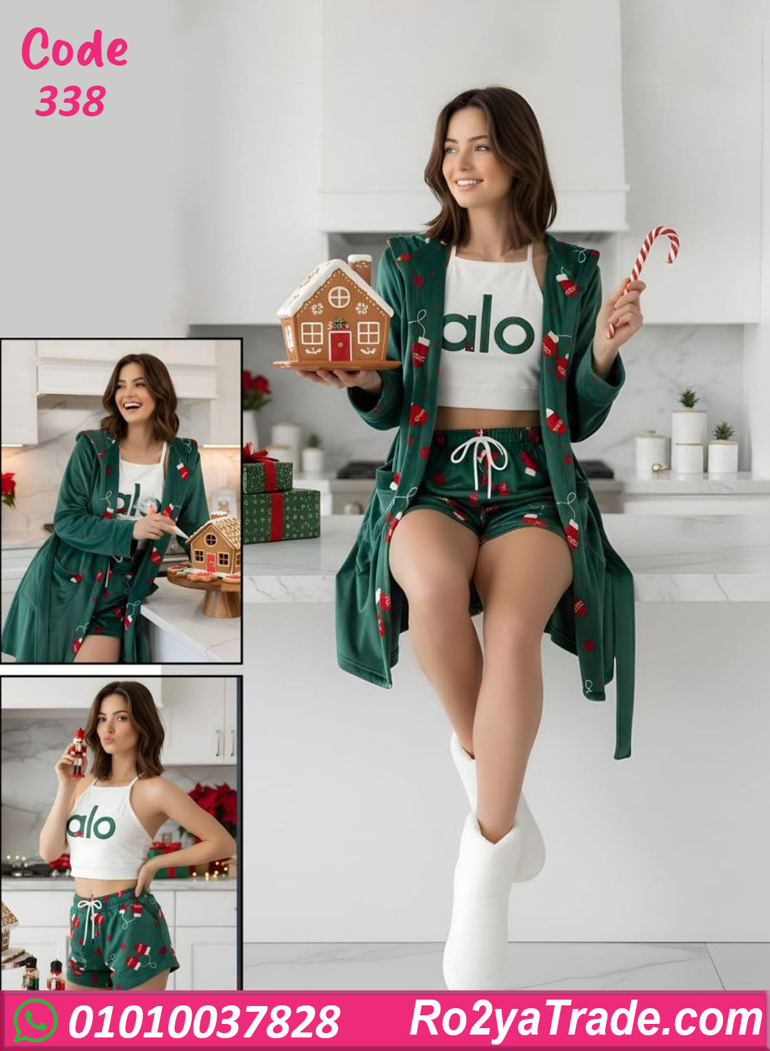 وهوت شورت شتوي مريح برباط، ومعاهم روب شتوي مفتوح بلمسة احتفالية مميزة، مناسب للأجواء الشتوية والاحتفالات.