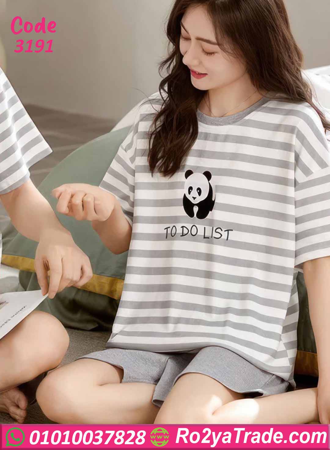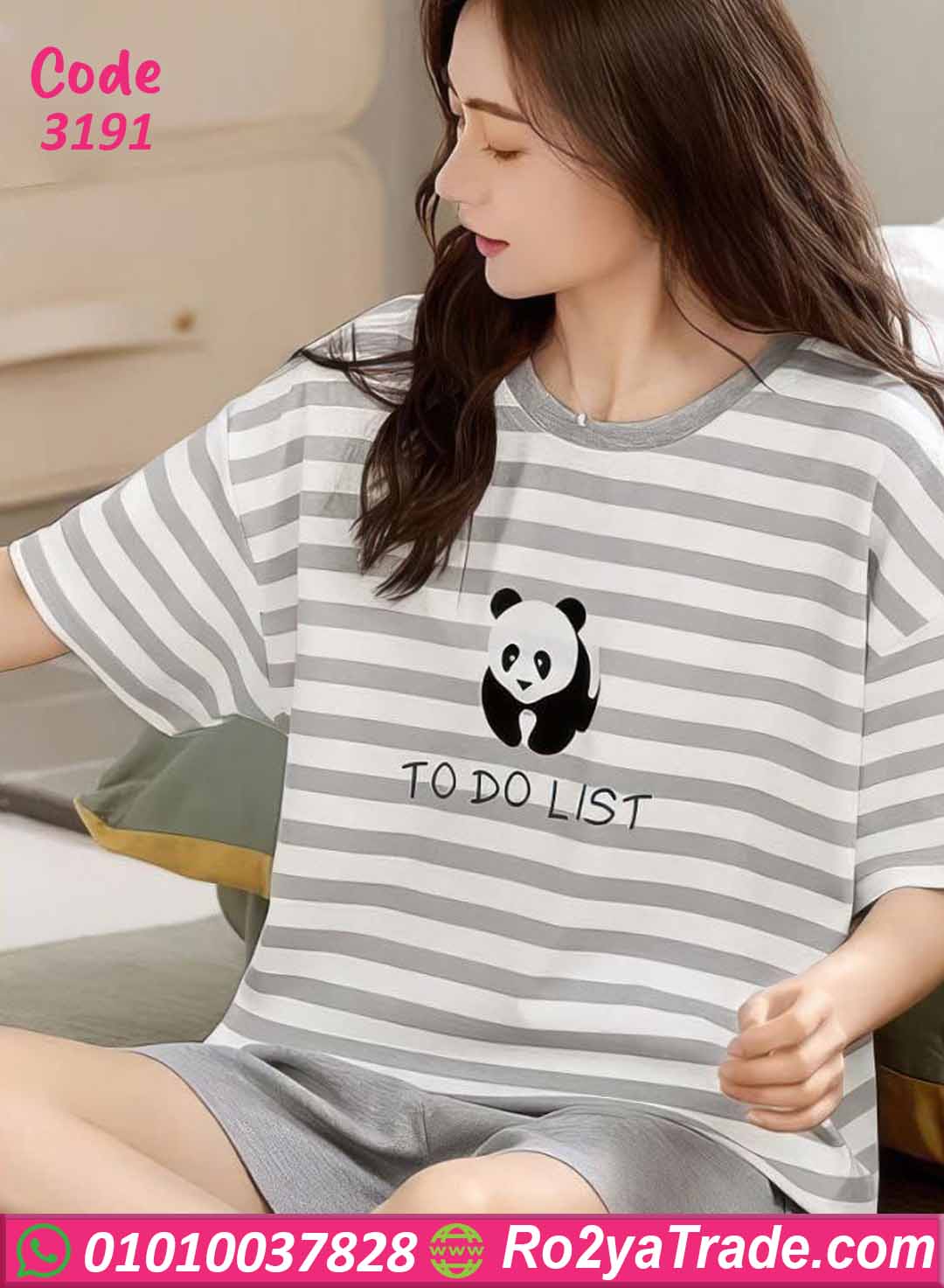 تأتي البيجامة بتصميم قطعتين (تيشيرت + هوت شورت)، حيث يتميز التيشيرت بقصة واسعة مريحة مع نقشة خطوط عصرية ورسمة باندا تضيف لمسة مرحة وكيوت.