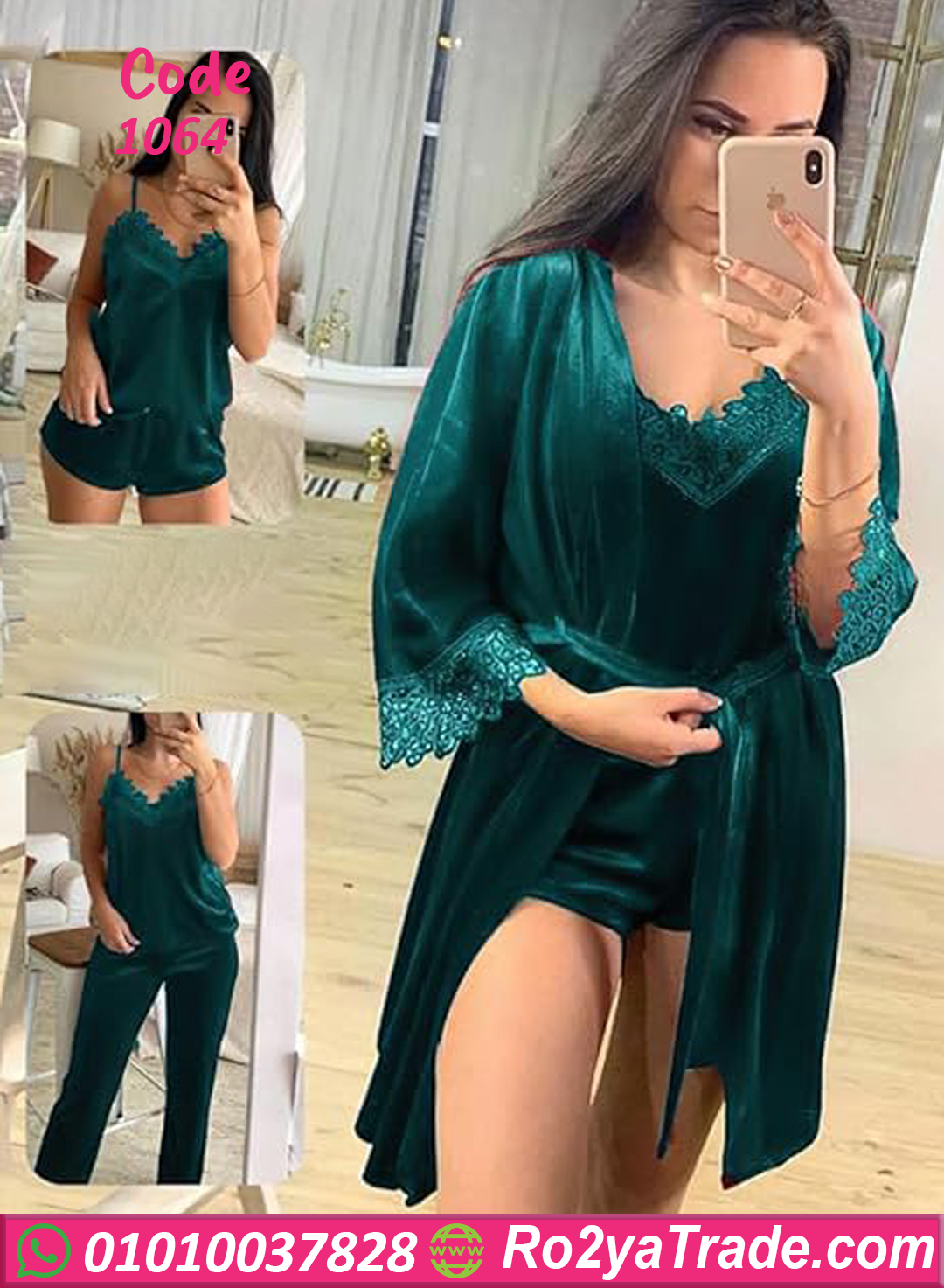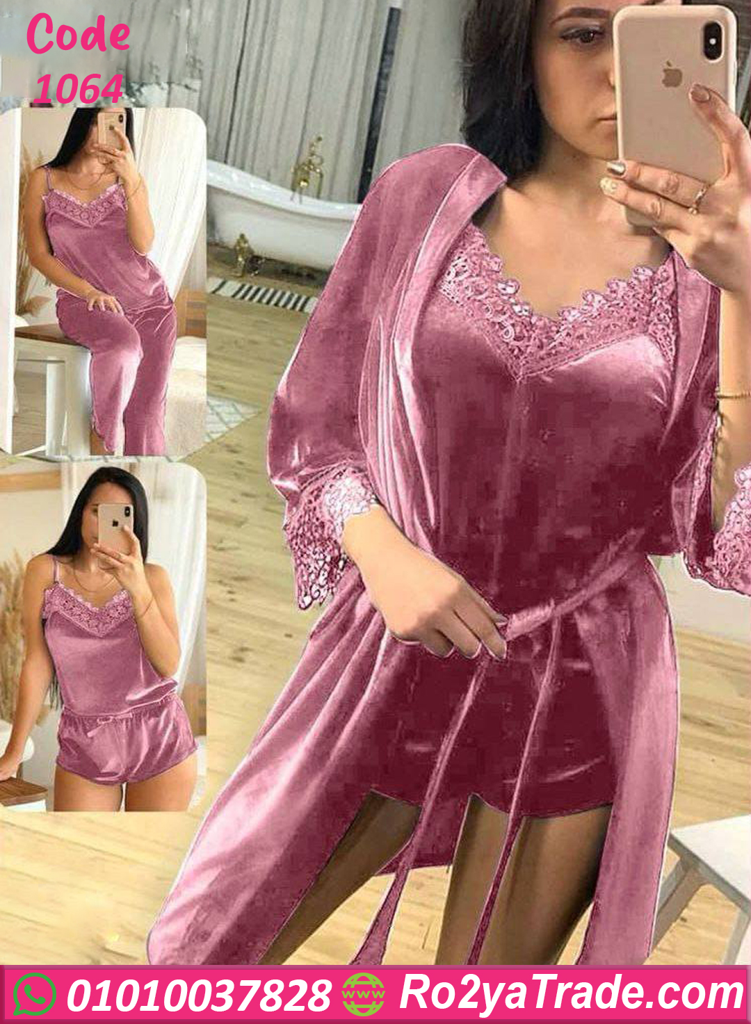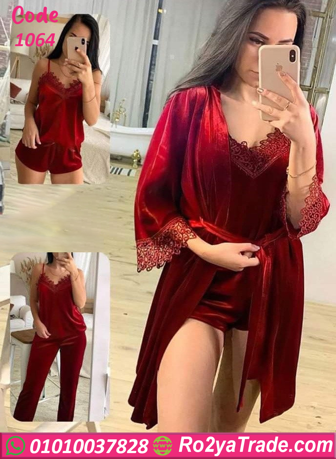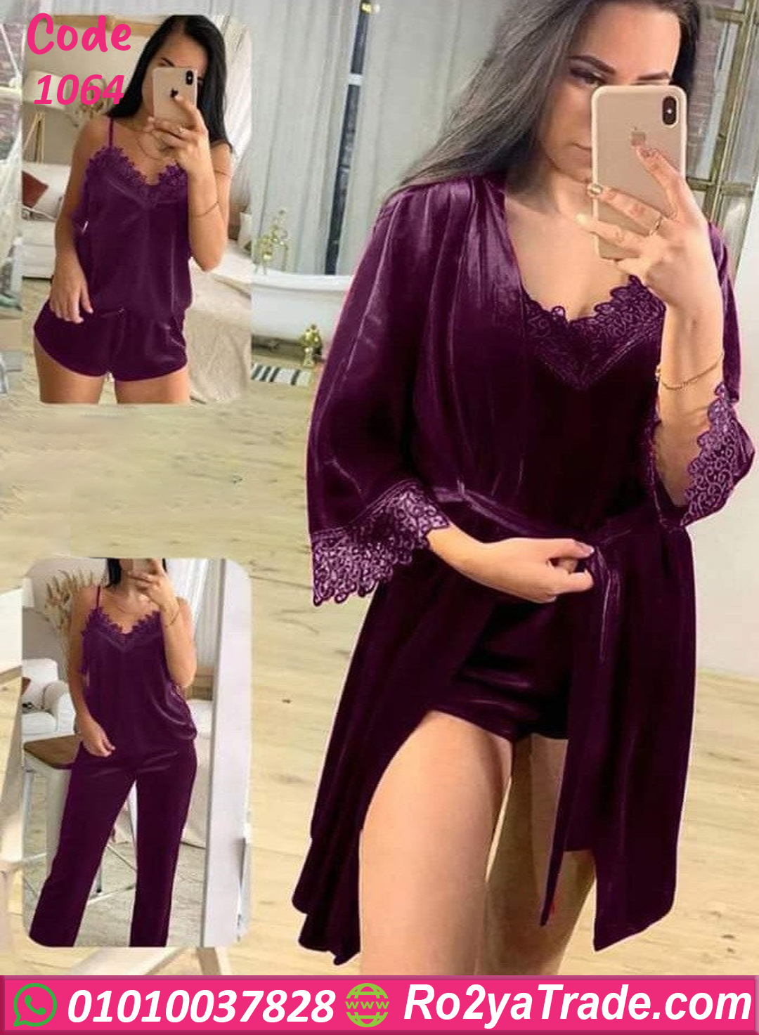 هوت شورت قطيفة شتوي ناعم وشيك بخامة فخمة وطريّة على الجسم، مع توب بكام مشغول بدانتيل رقيق وروب قصير بنفس الخامة عشان يكمل الطقم بشكل جذاب ومودرن جدًا.